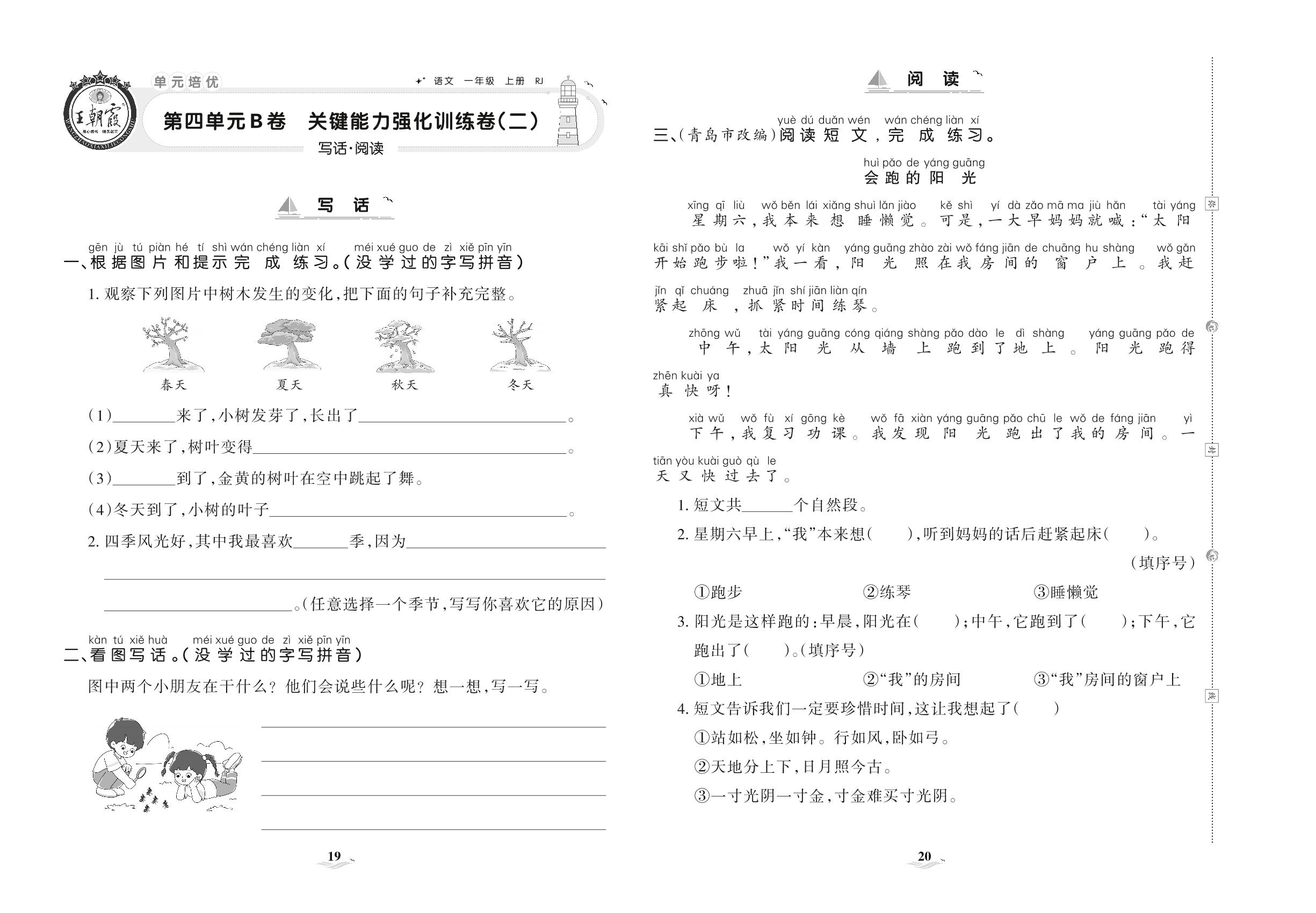 2021上册一年级语文人教版 第四单元B卷 关键能力强化训练卷(二)