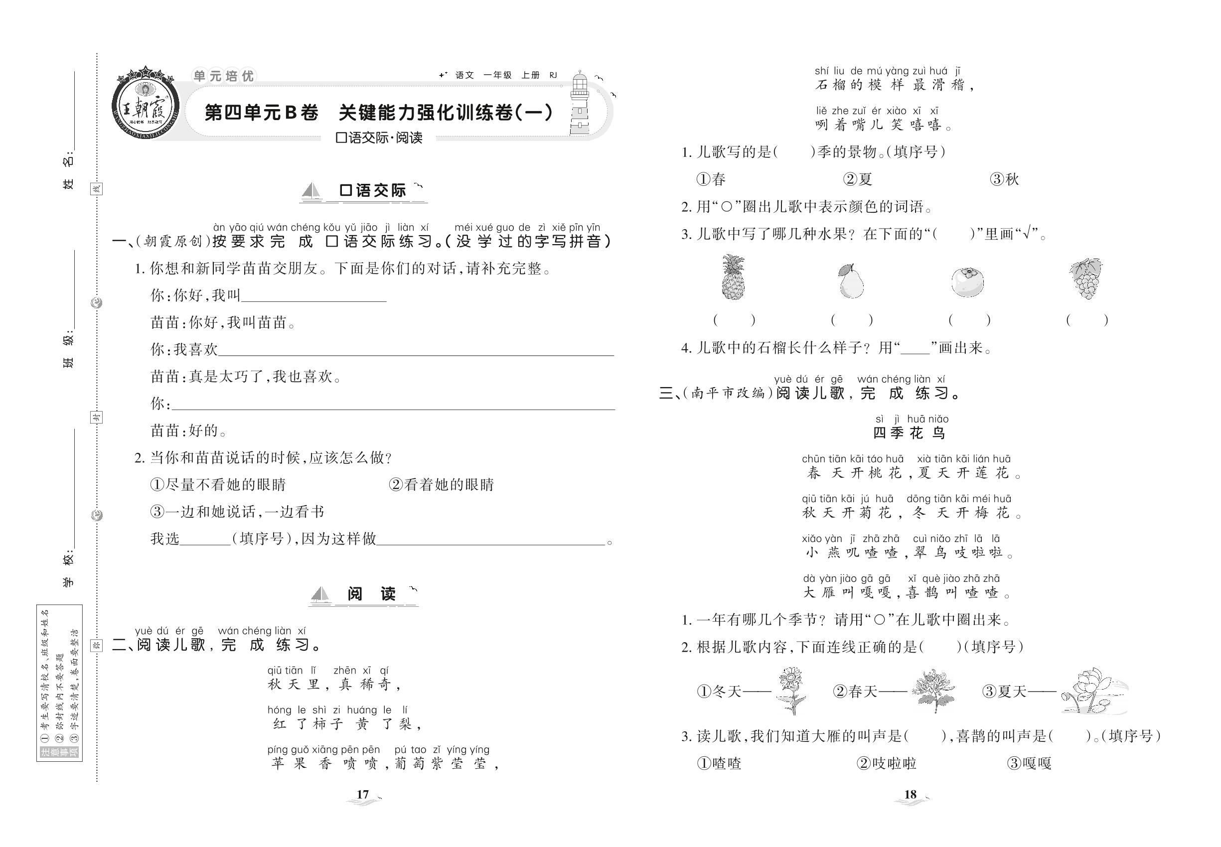 2021上册一年级语文人教版 第四单元B卷 关键能力强化训练卷(一)