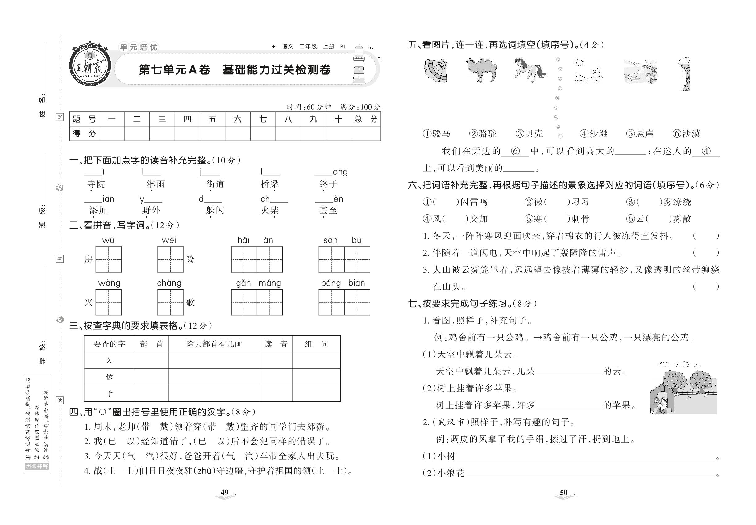 2021上册二年级语文人教版 第七单元A卷 基础能力过关检测卷
