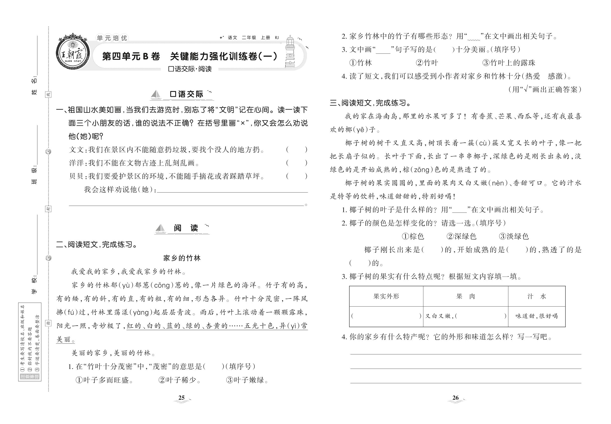 2021上册二年级语文人教版 第四单元B卷 关键能力强化训练卷(一)