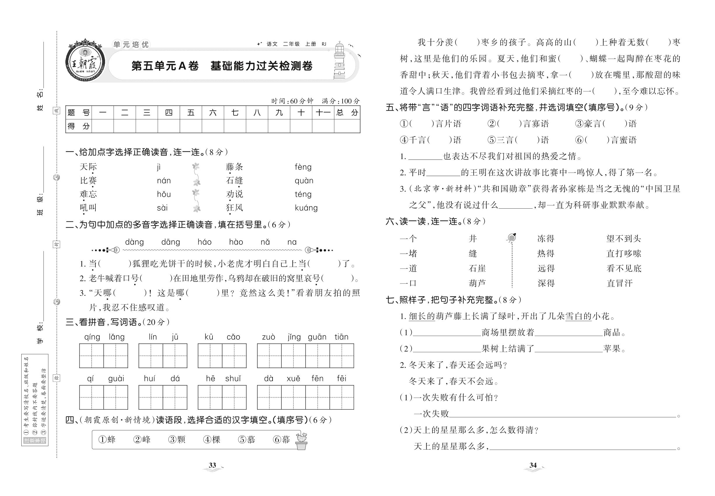2021上册二年级语文人教版 第五单元A卷 基础能力过关检测卷