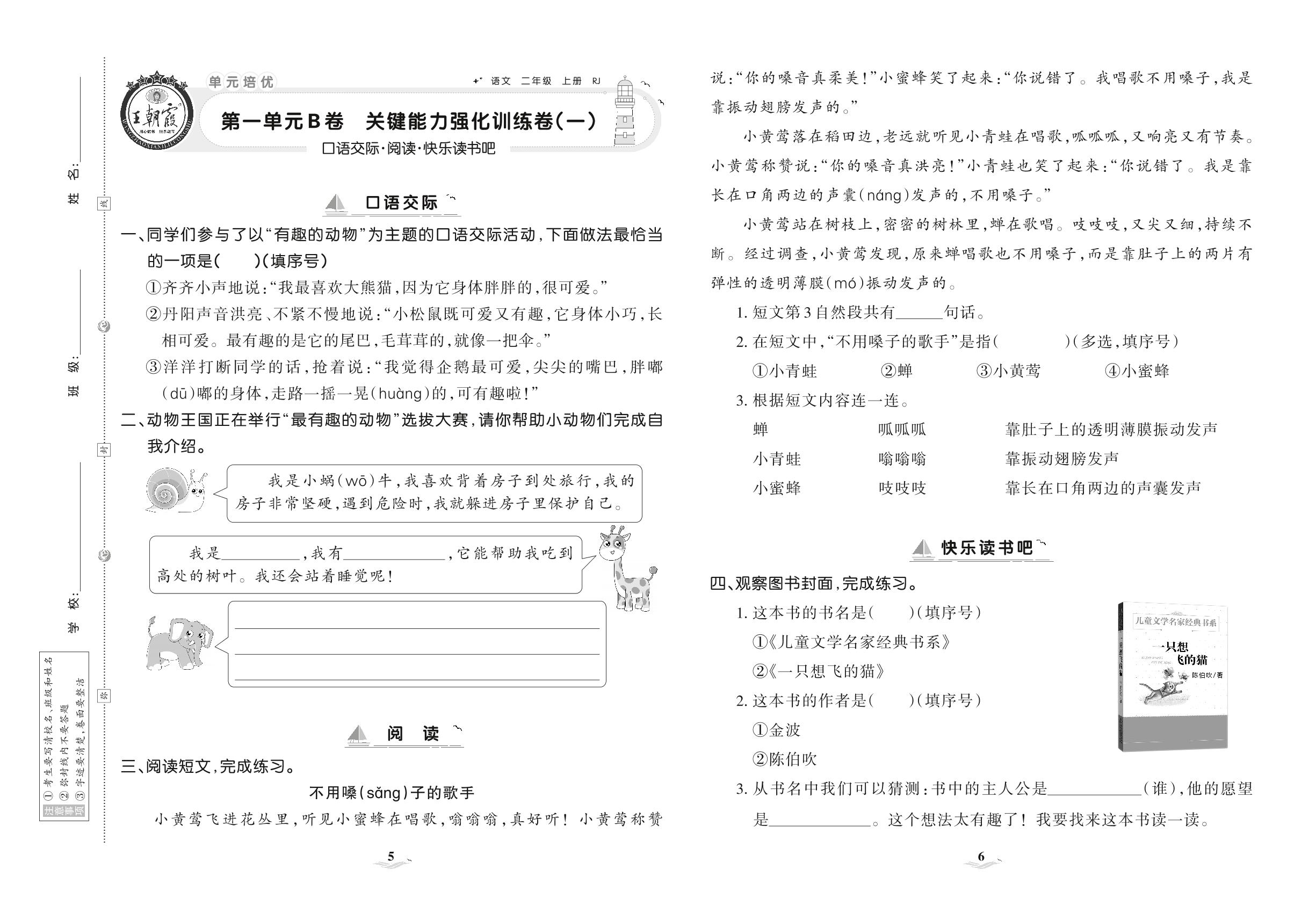2021上册二年级语文人教版 第一单元B卷 关键能力强化训练卷(一)