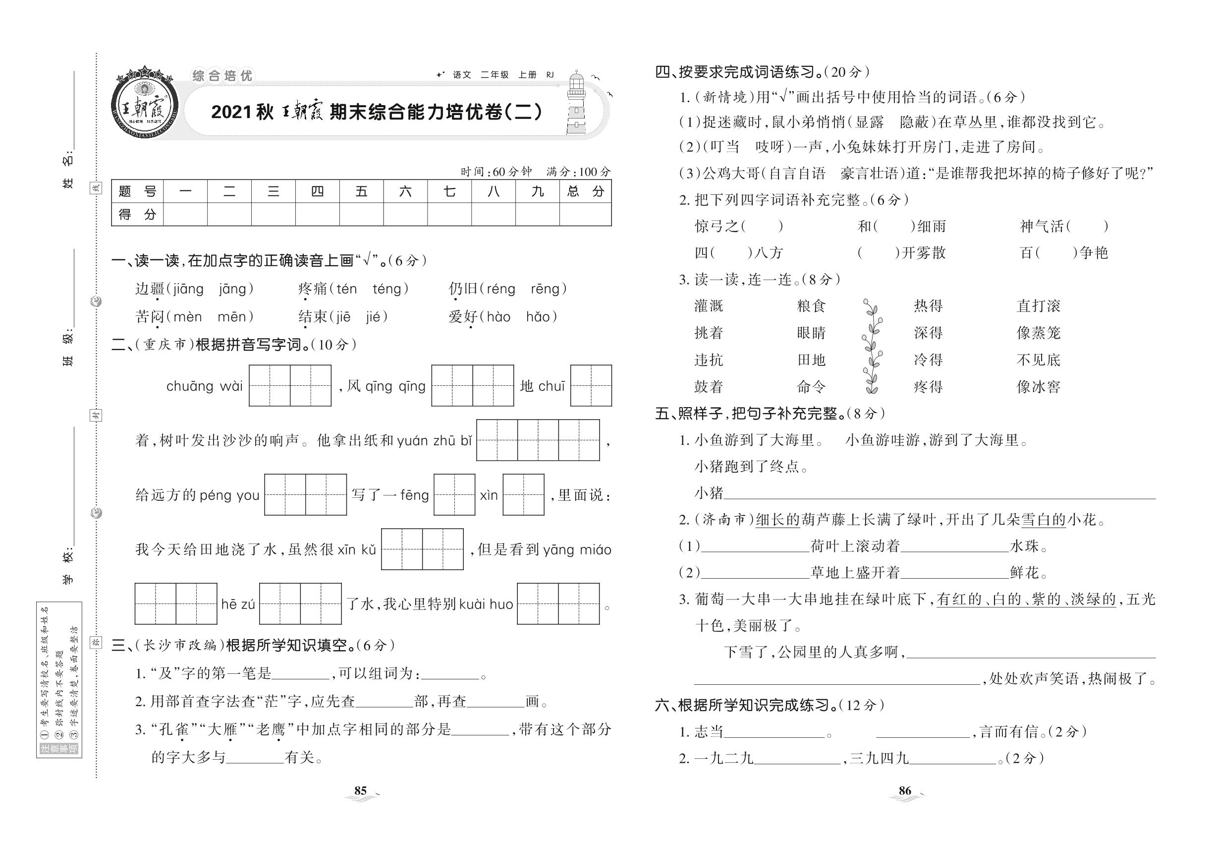 2021上册二年级语文人教版 王朝霞期末综合能力培优卷(二)
