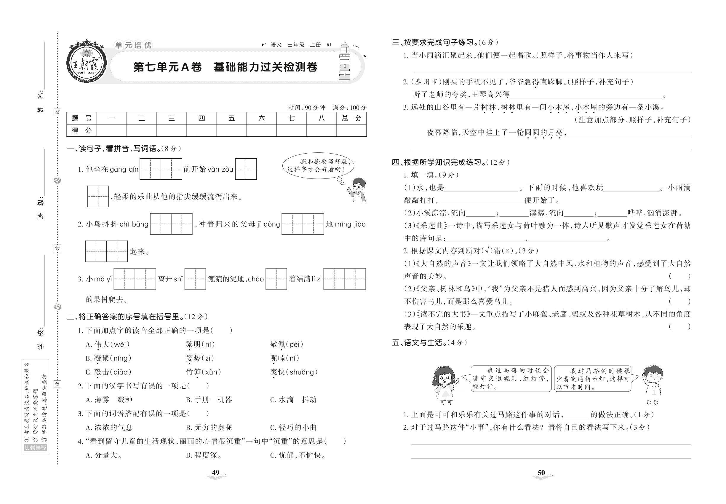 2021上册三年级语文人教版 第七单元A卷 基础能力过关检测卷
