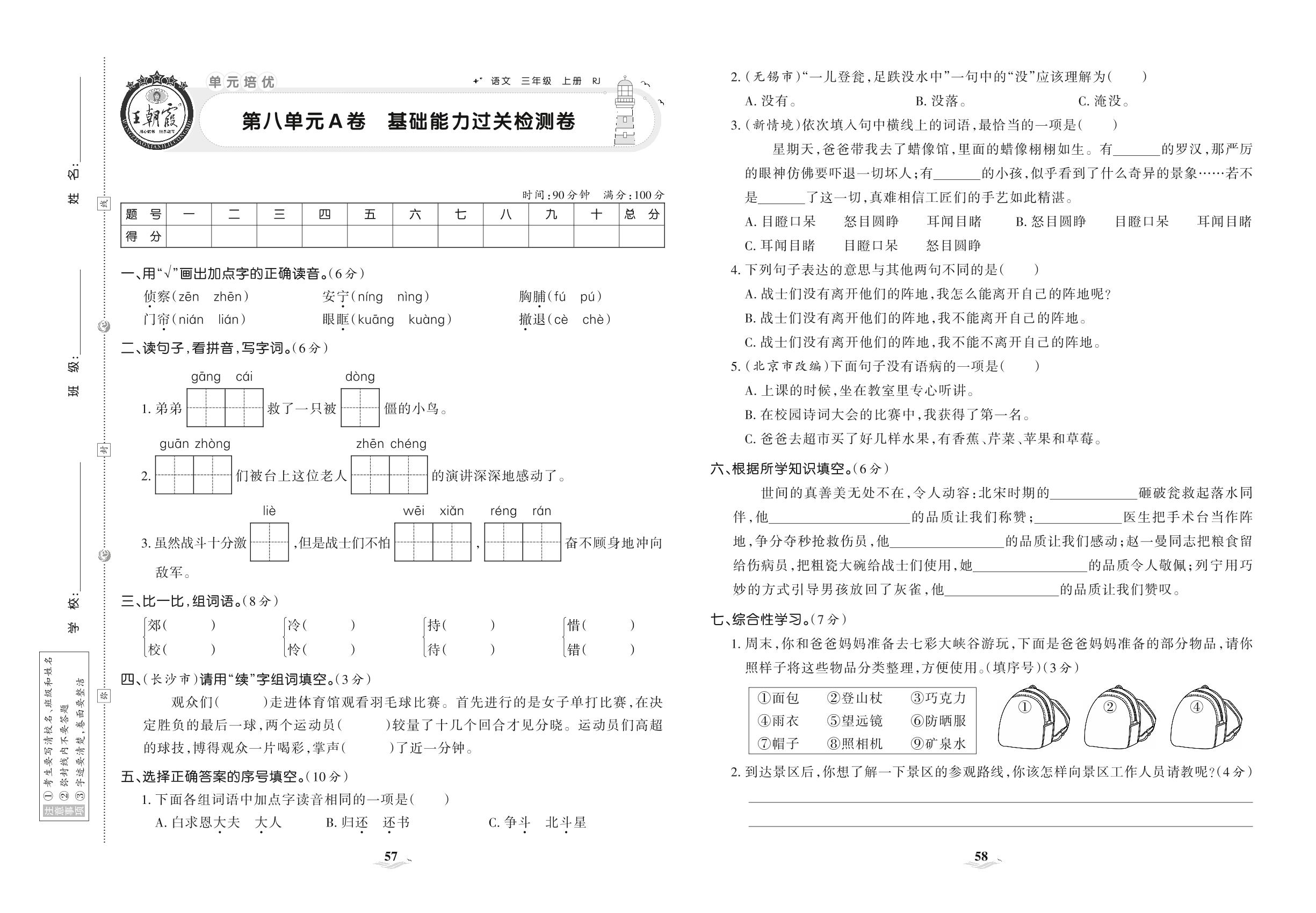 2021上册三年级语文人教版 第八单元A卷 基础能力过关检测卷