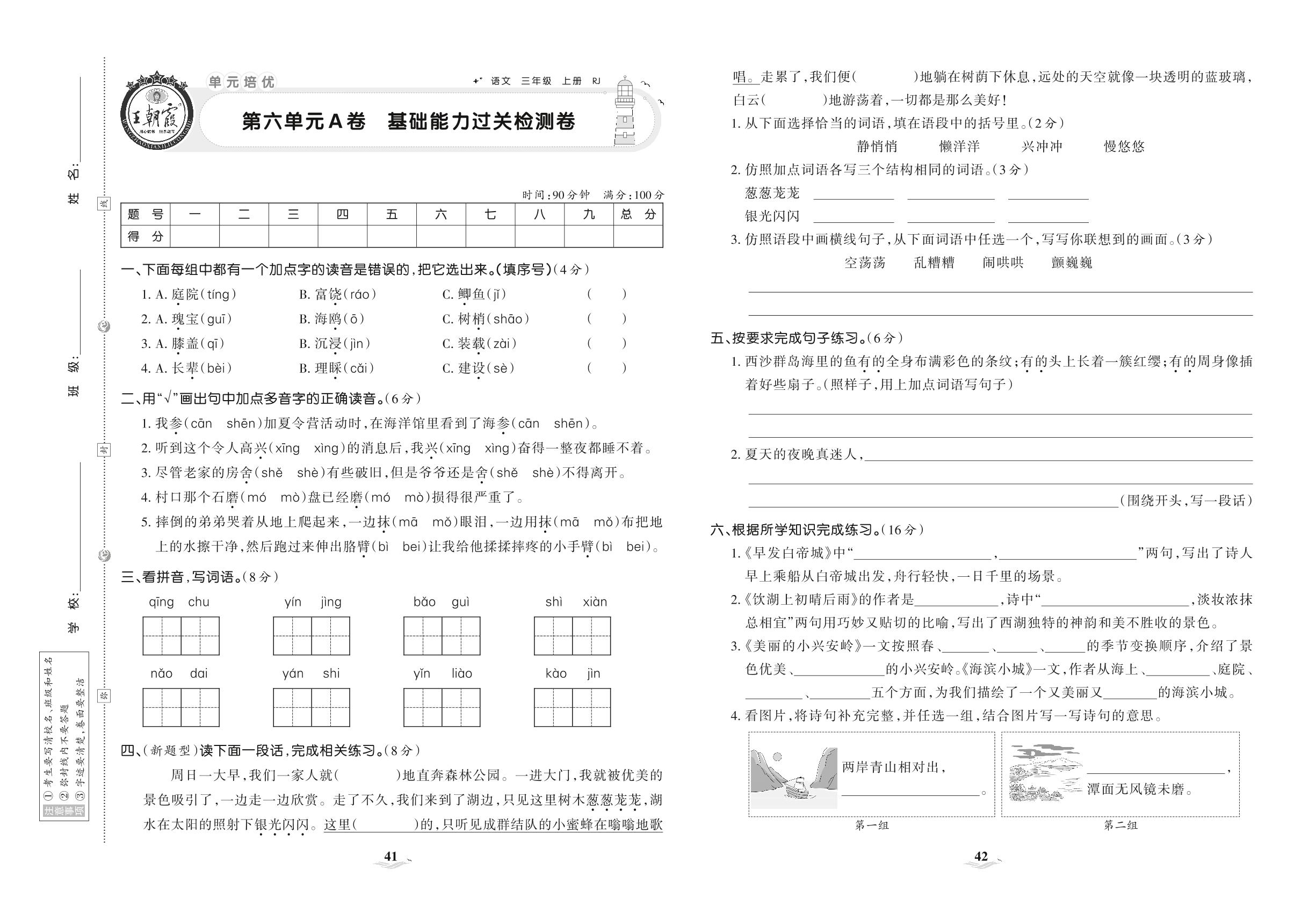 2021上册三年级语文人教版 第六单元A卷 基础能力过关检测卷