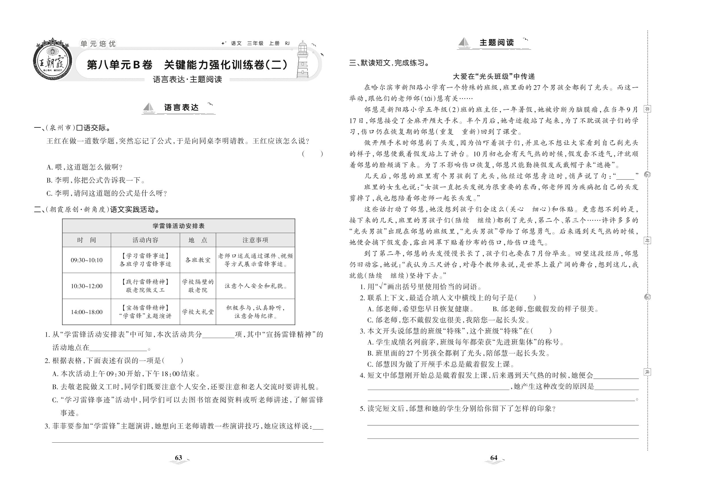 2021上册三年级语文人教版 第八单元B卷 关键能力强化训练卷(二)