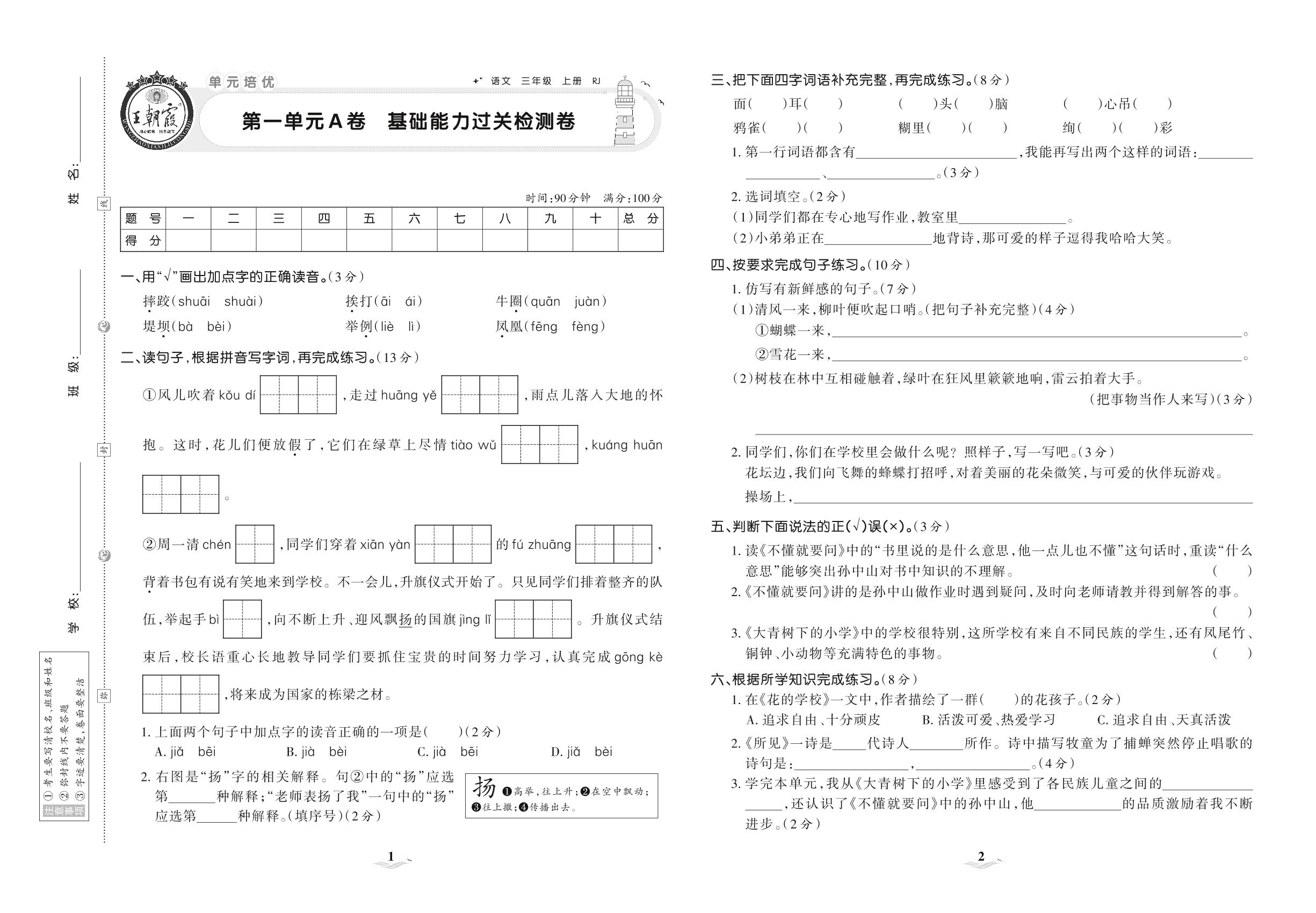2021上册三年级语文人教版 第一单元A卷 基础能力过关检测卷