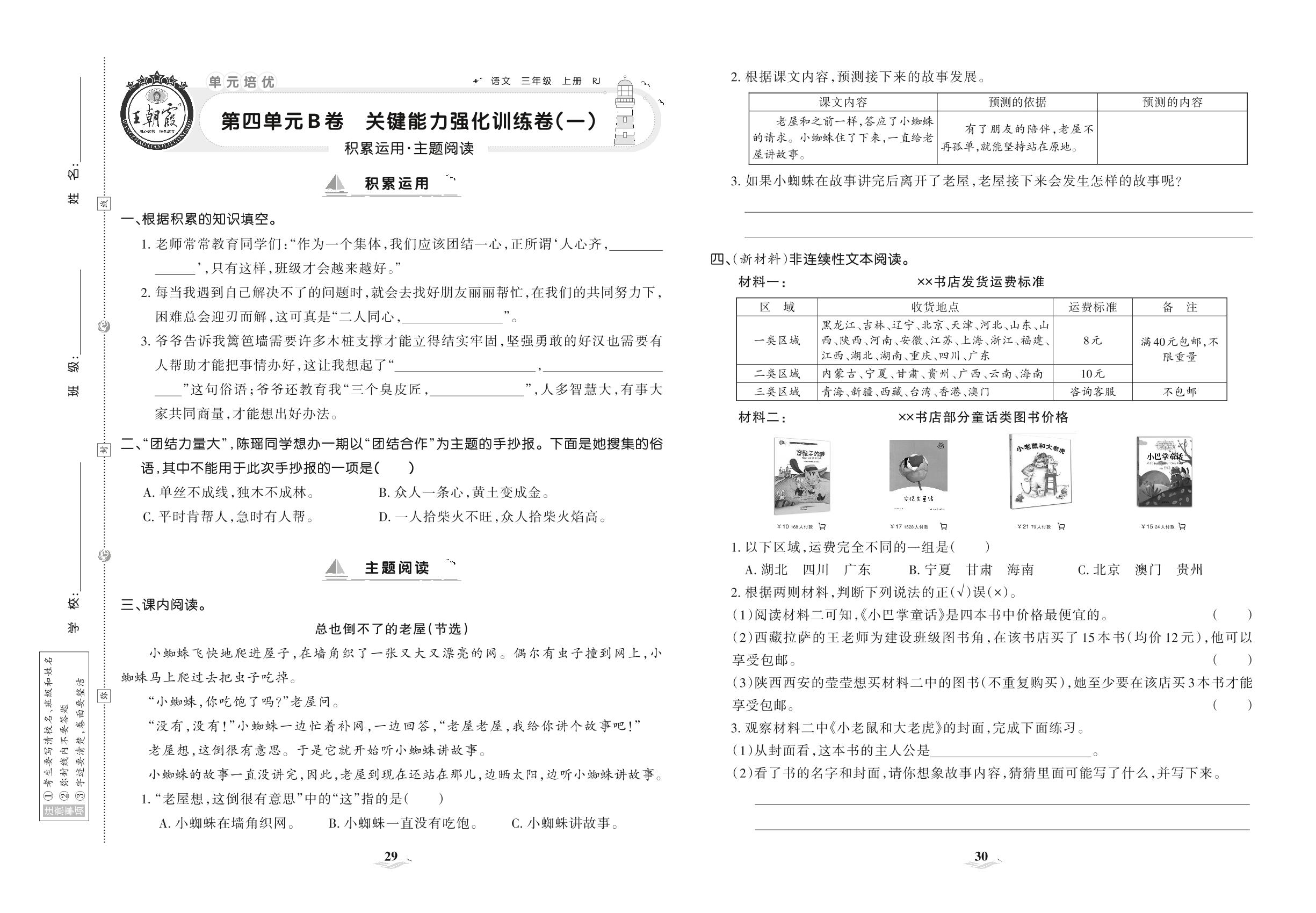 2021上册三年级语文人教版 第四单元B卷 关键能力强化训练卷(一)