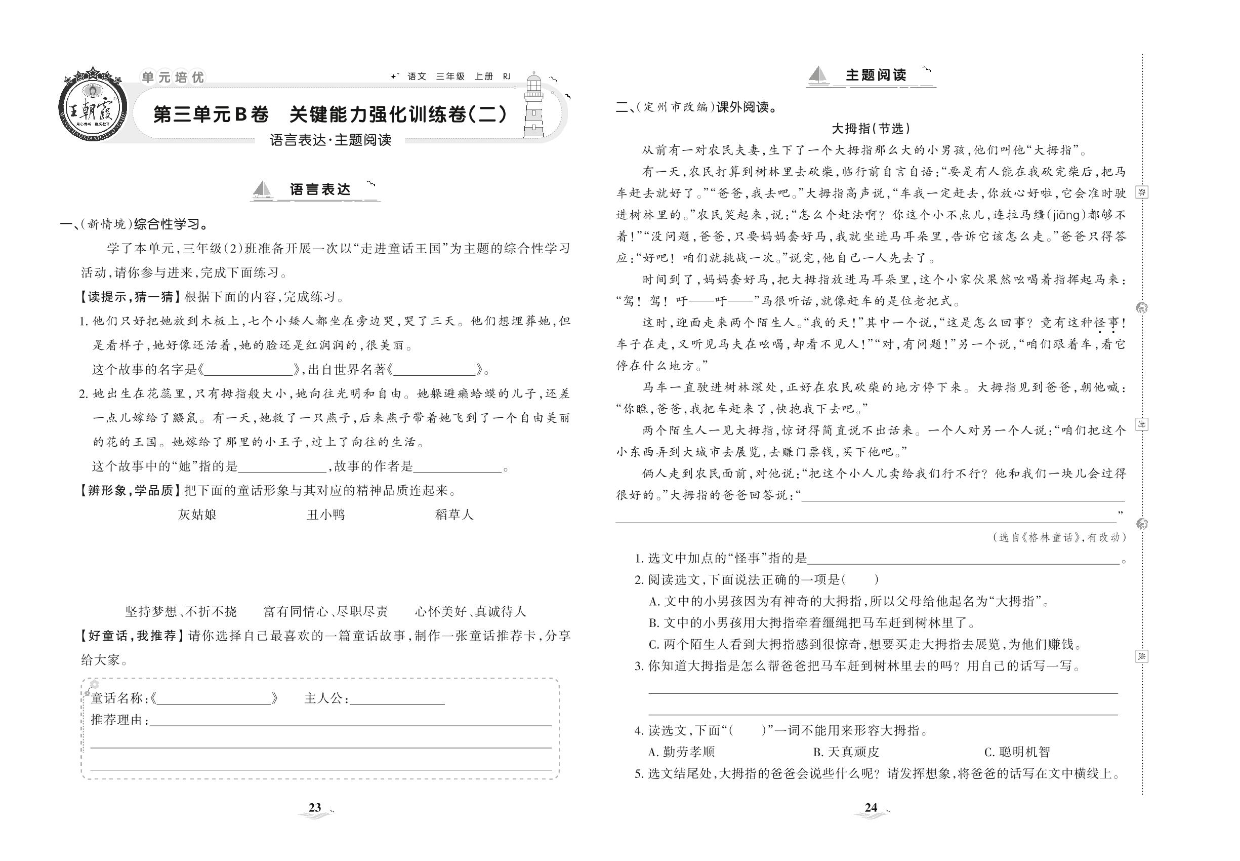 2021上册三年级语文人教版 第三单元B卷 关键能力强化训练卷(二)