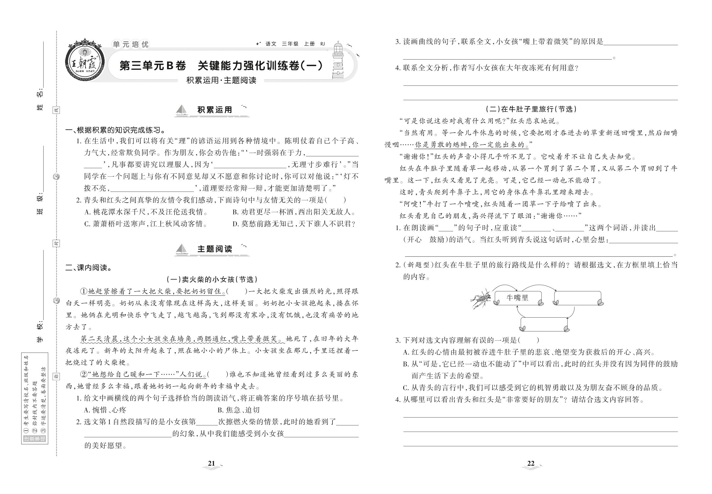 2021上册三年级语文人教版 第三单元B卷 关键能力强化训练卷(一)