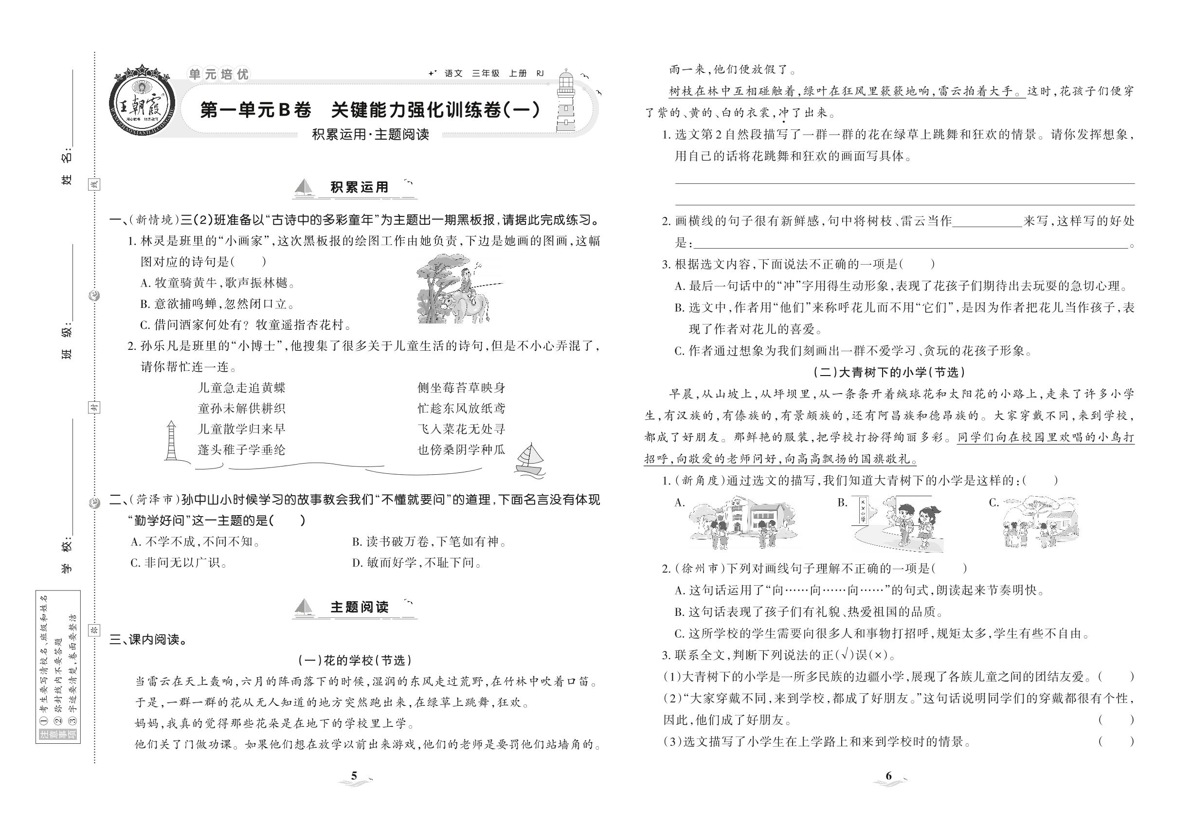 2021上册三年级语文人教版 第一单元B卷 关键能力强化训练卷(一)