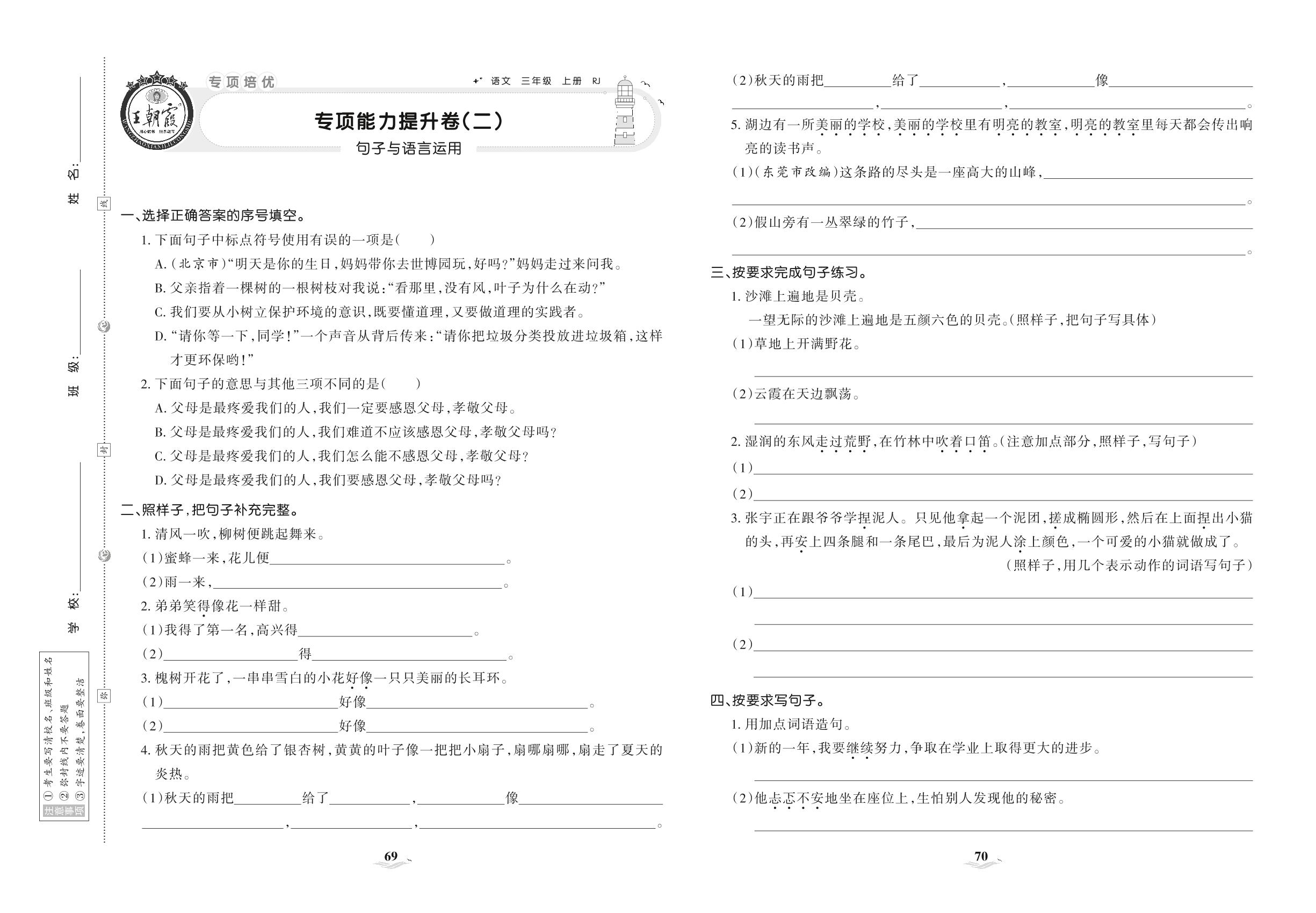2021上册三年级语文人教版 专项能力提升卷(二) 句子与语言运用
