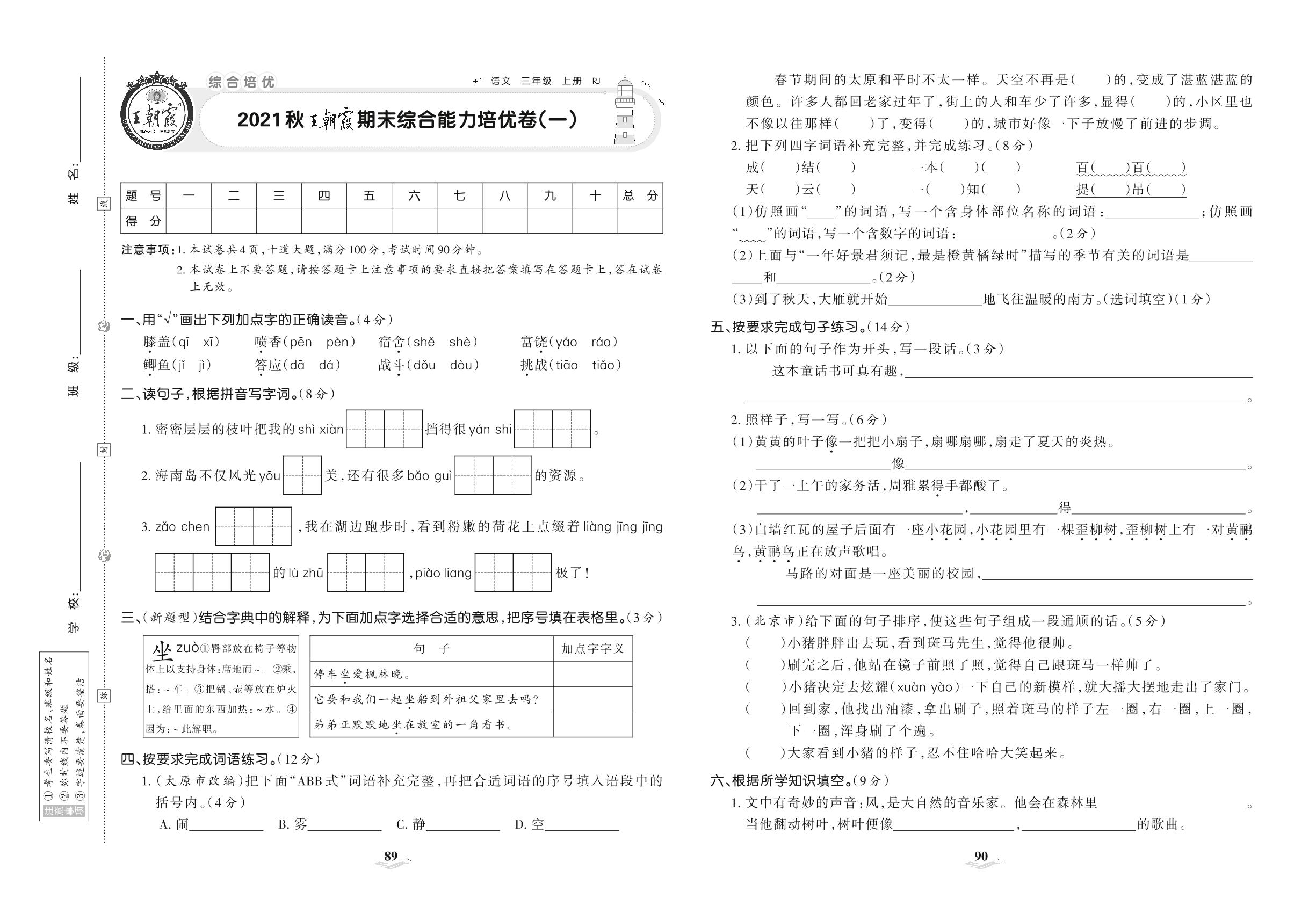 2021上册三年级语文人教版 王朝霞期末综合能力培优卷(一)