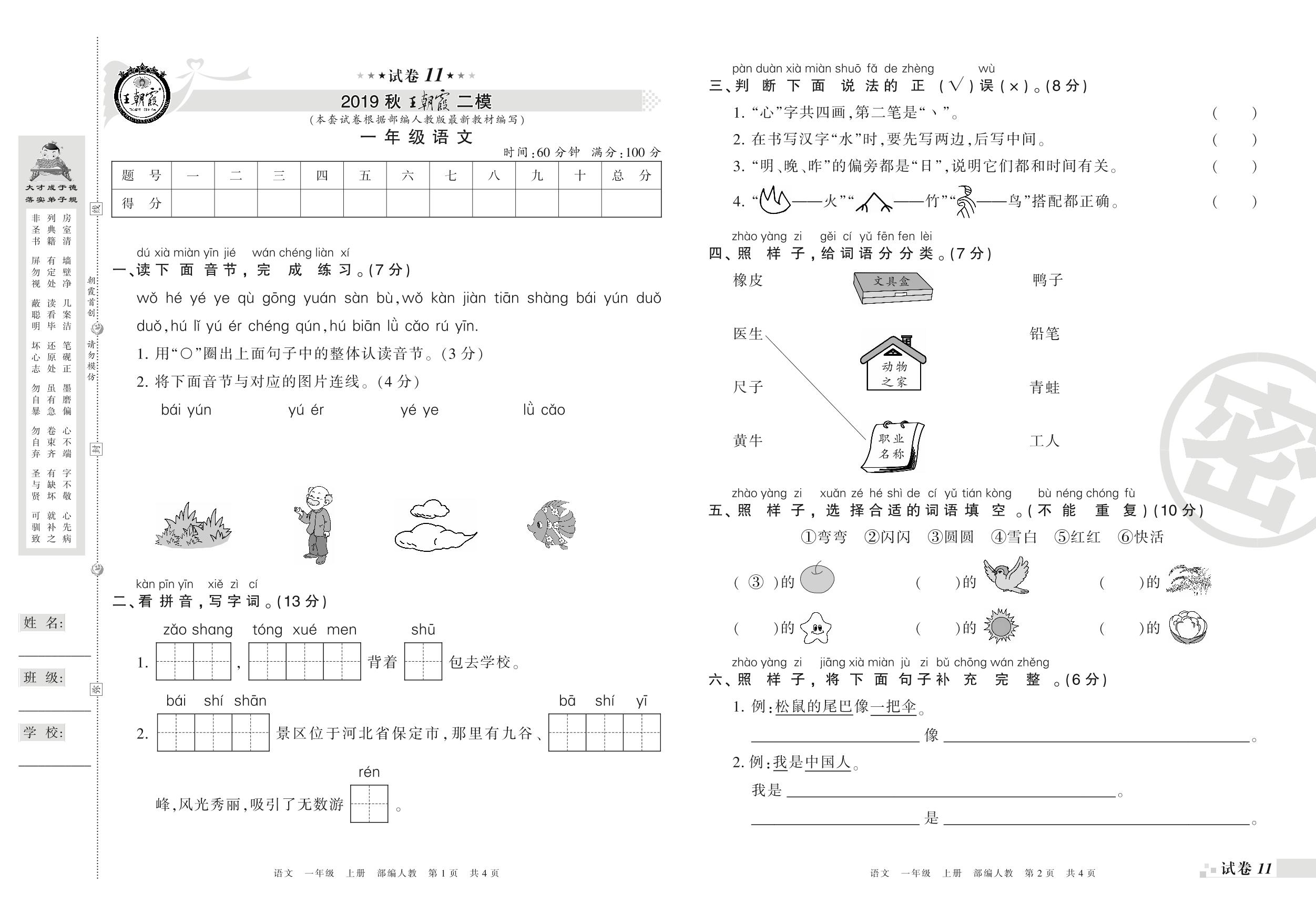 王朝霞期末模拟卷一年级上册语文(人教版)_R210731181810【11】