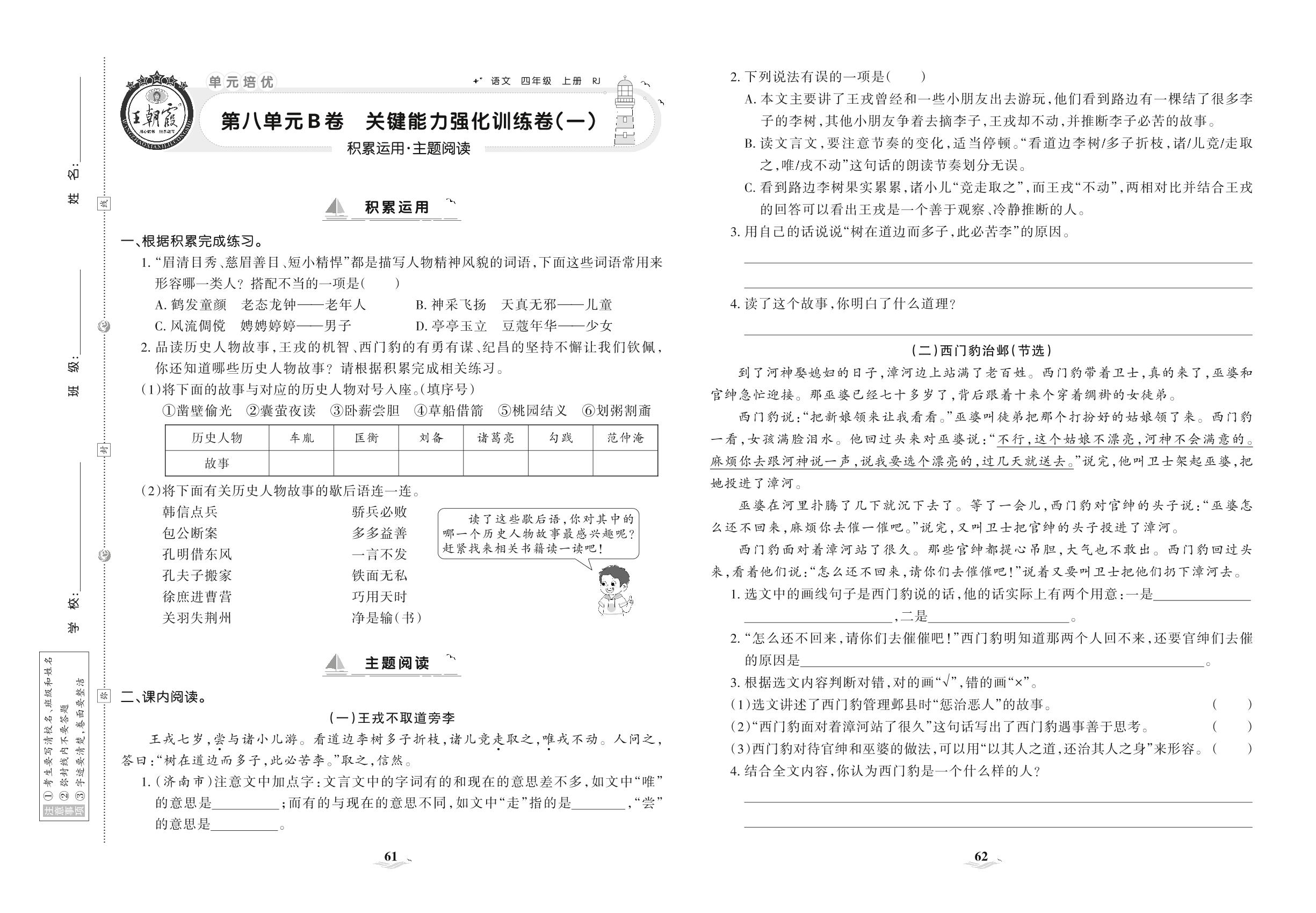 2021上册四年级语文人教版 第八单元 B卷 关键能力强化训练卷(一)
