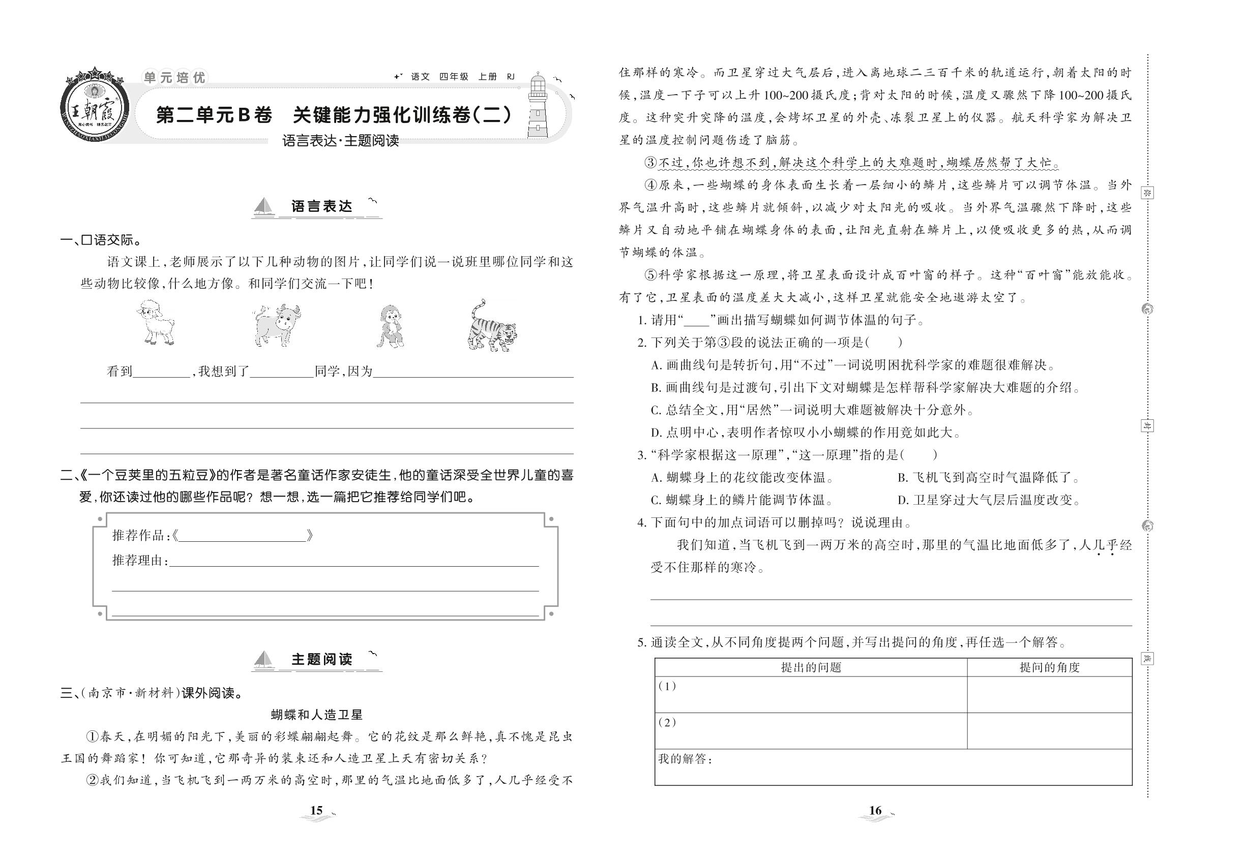 2021上册四年级语文人教版 第二单元 B卷 关键能力强化训练卷(二)