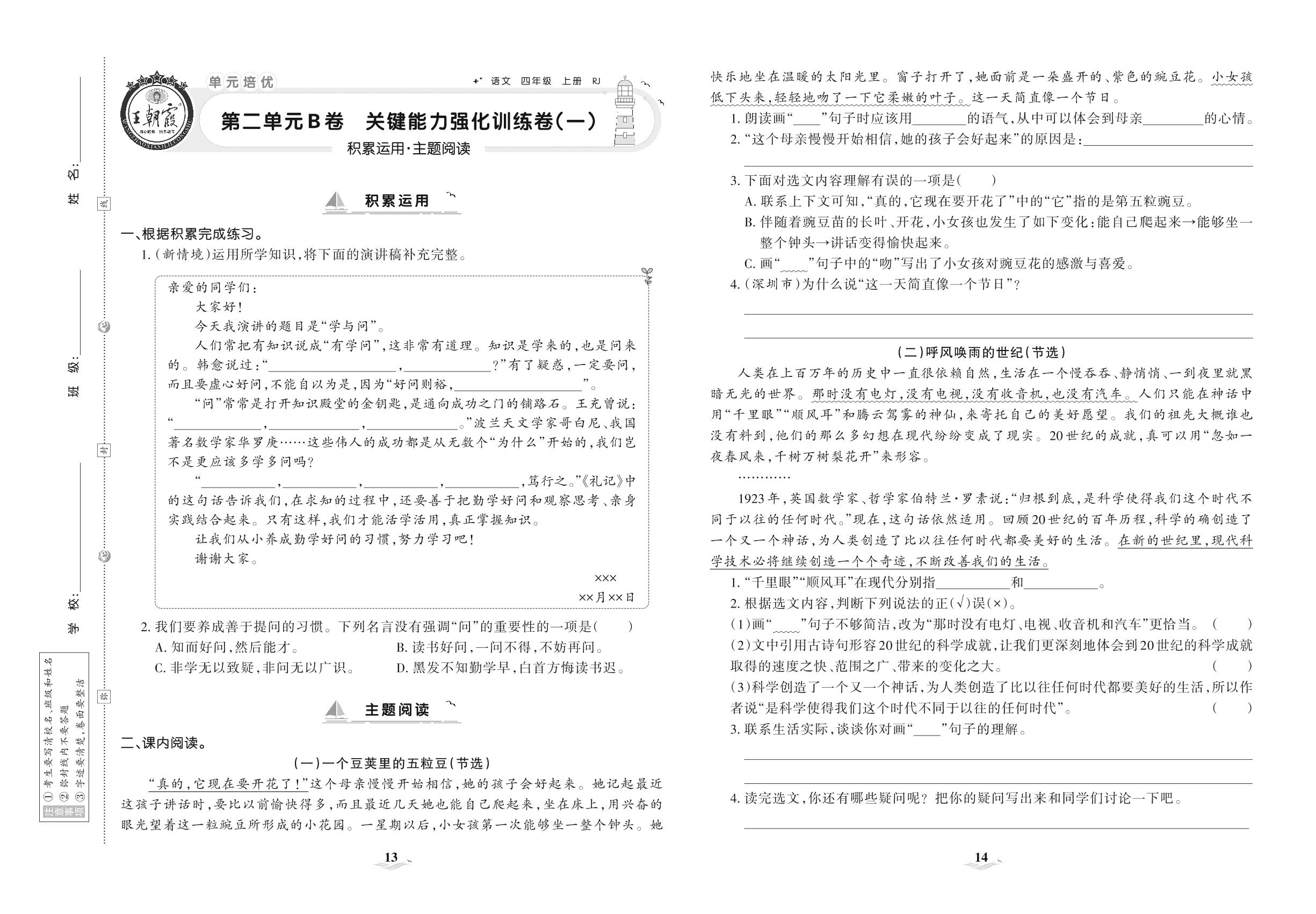 2021上册四年级语文人教版 第二单元 B卷 关键能力强化训练卷(一)