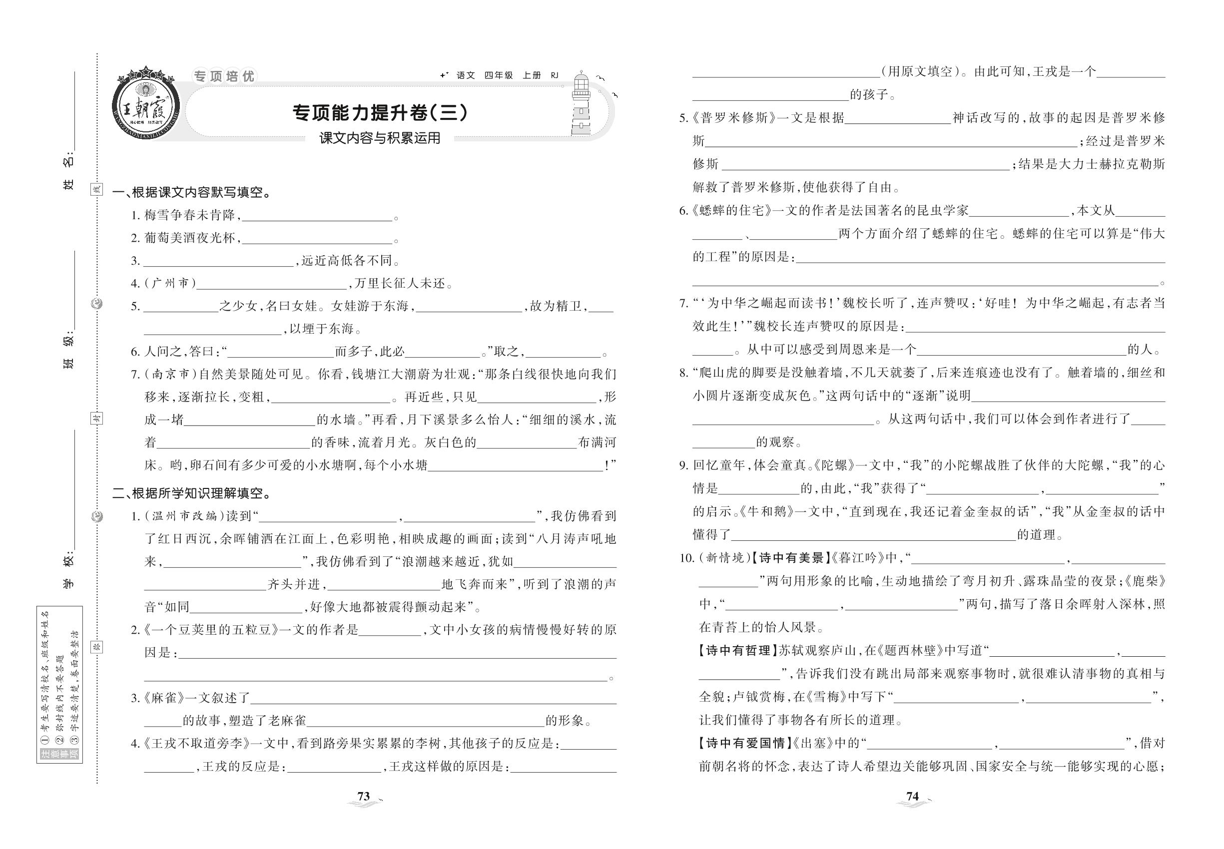 2021上册四年级语文人教版 专项能力提升卷(三) 课文内容与积累运用