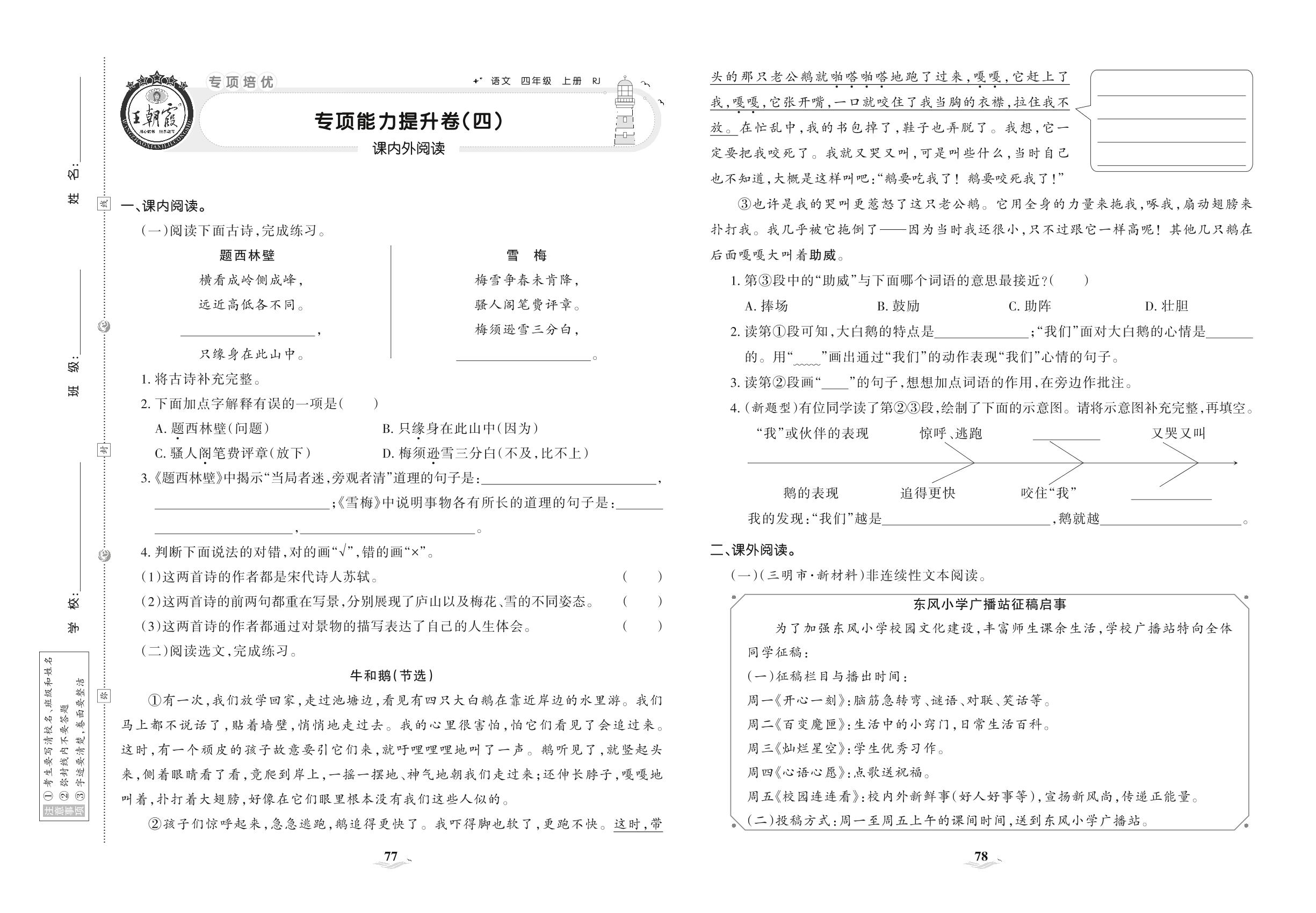 2021上册四年级语文人教版 专项能力提升卷(四) 课内外阅读