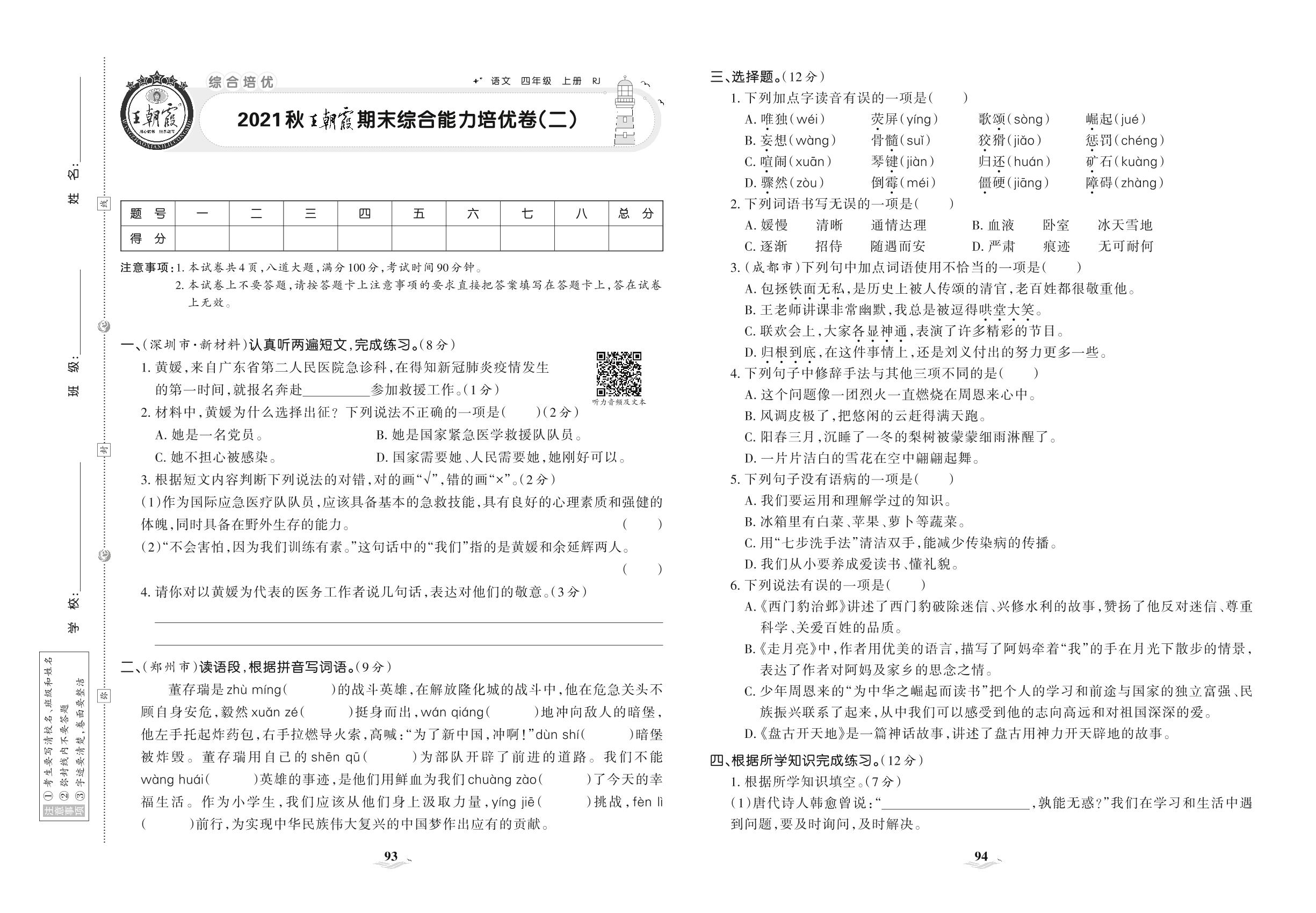 2021上册四年级语文人教版 王朝霞期末综合能力培优卷(二)