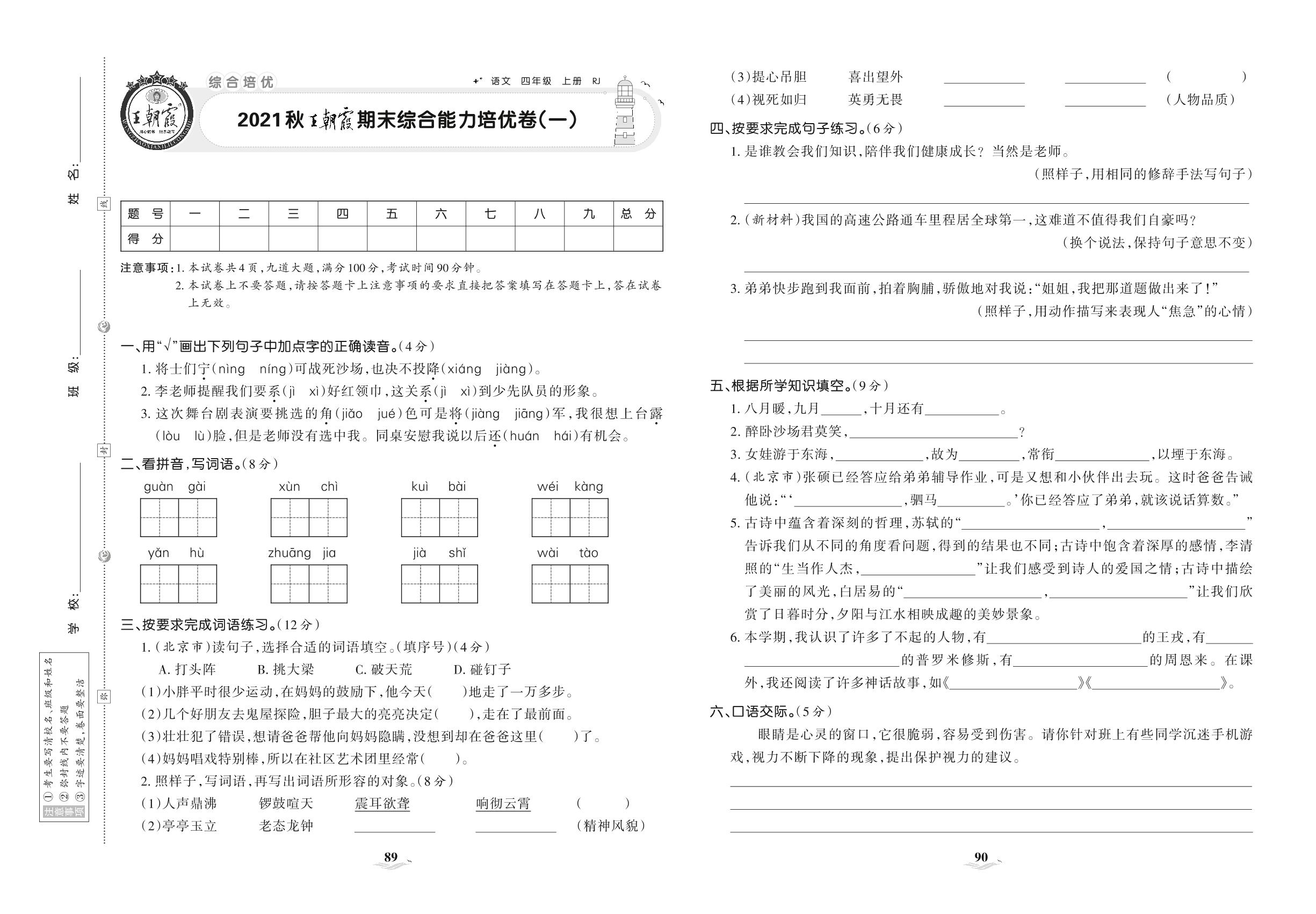 2021上册四年级语文人教版 王朝霞期末综合能力培优卷(一)