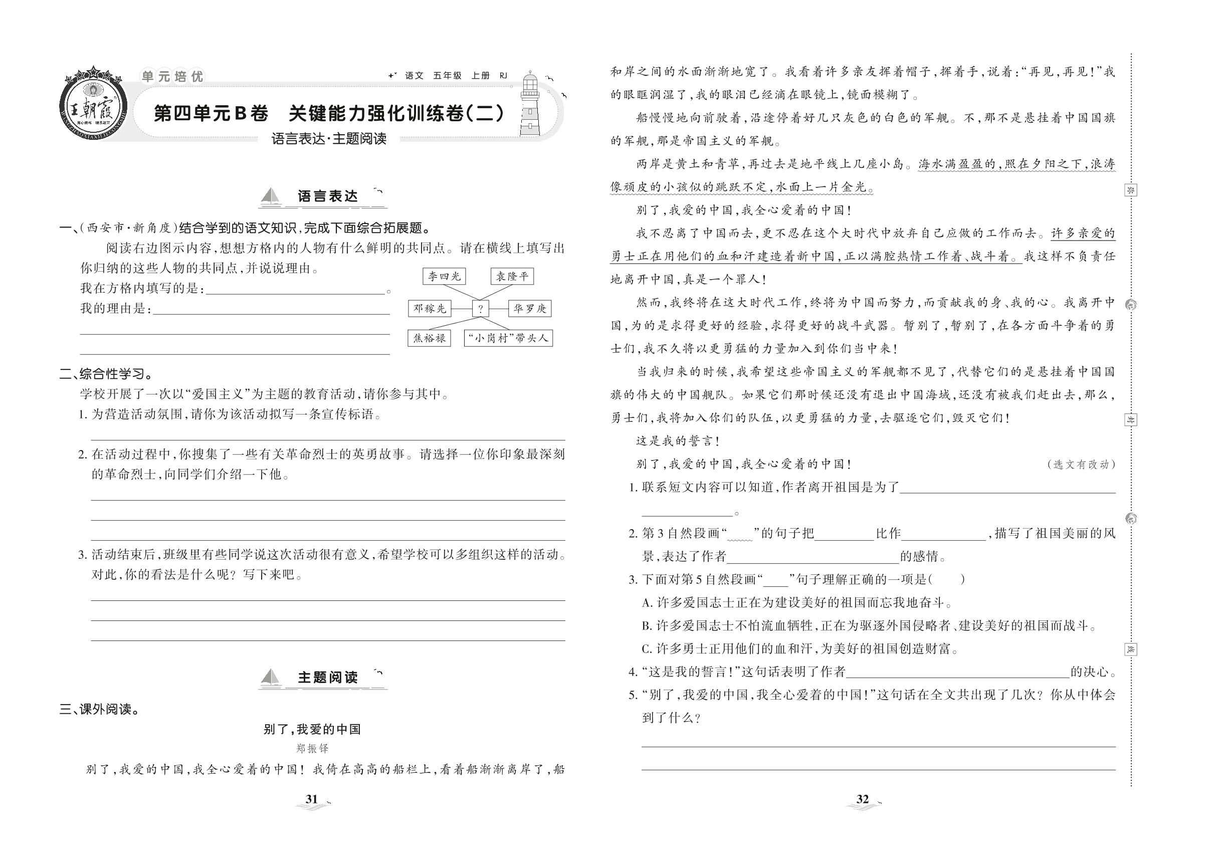 2021上册五年级语文人教版 第四单元B卷 关键能力强化训练卷(二)