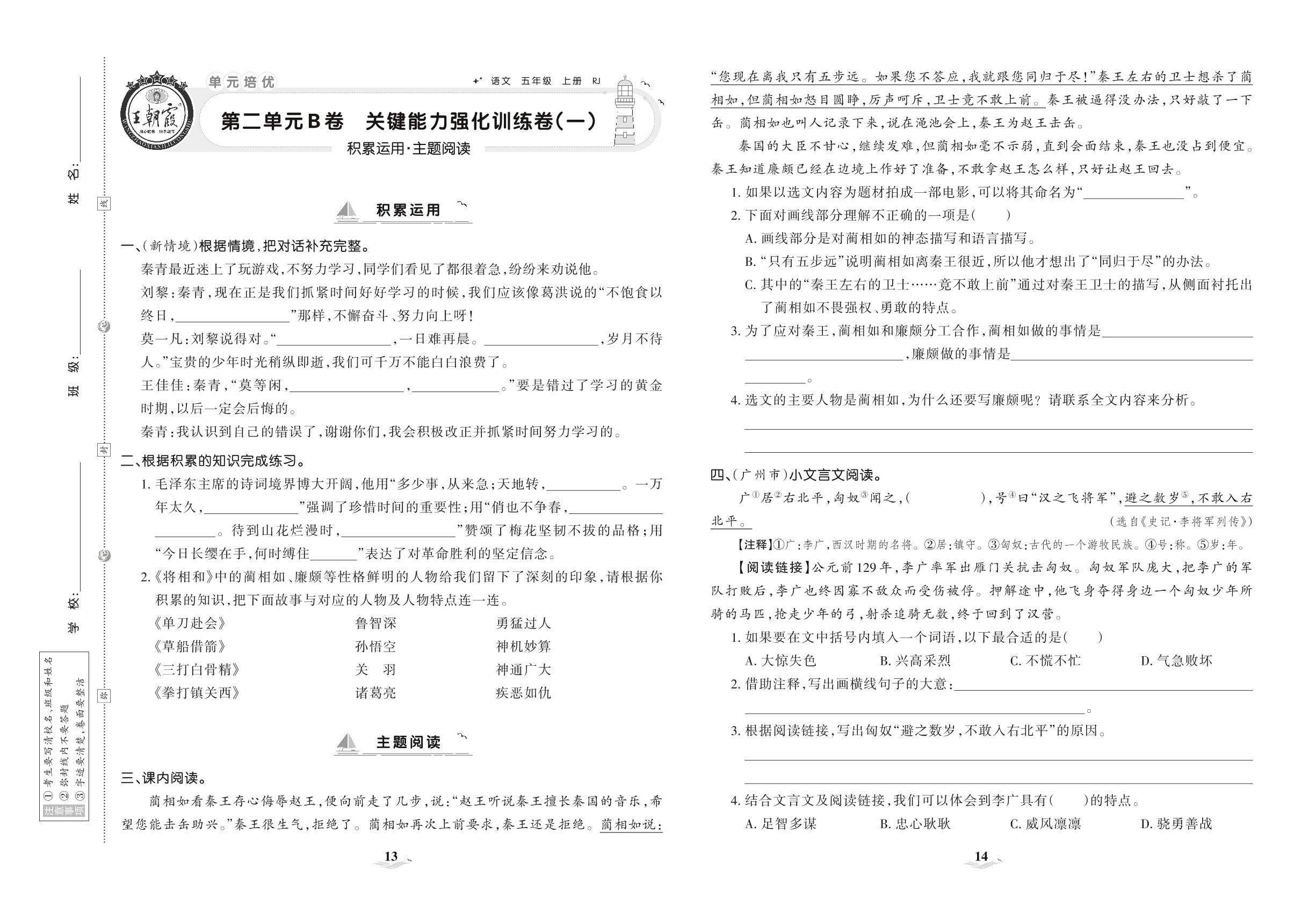 2021上册五年级语文人教版 第二单元B卷 关键能力强化训练卷(一)