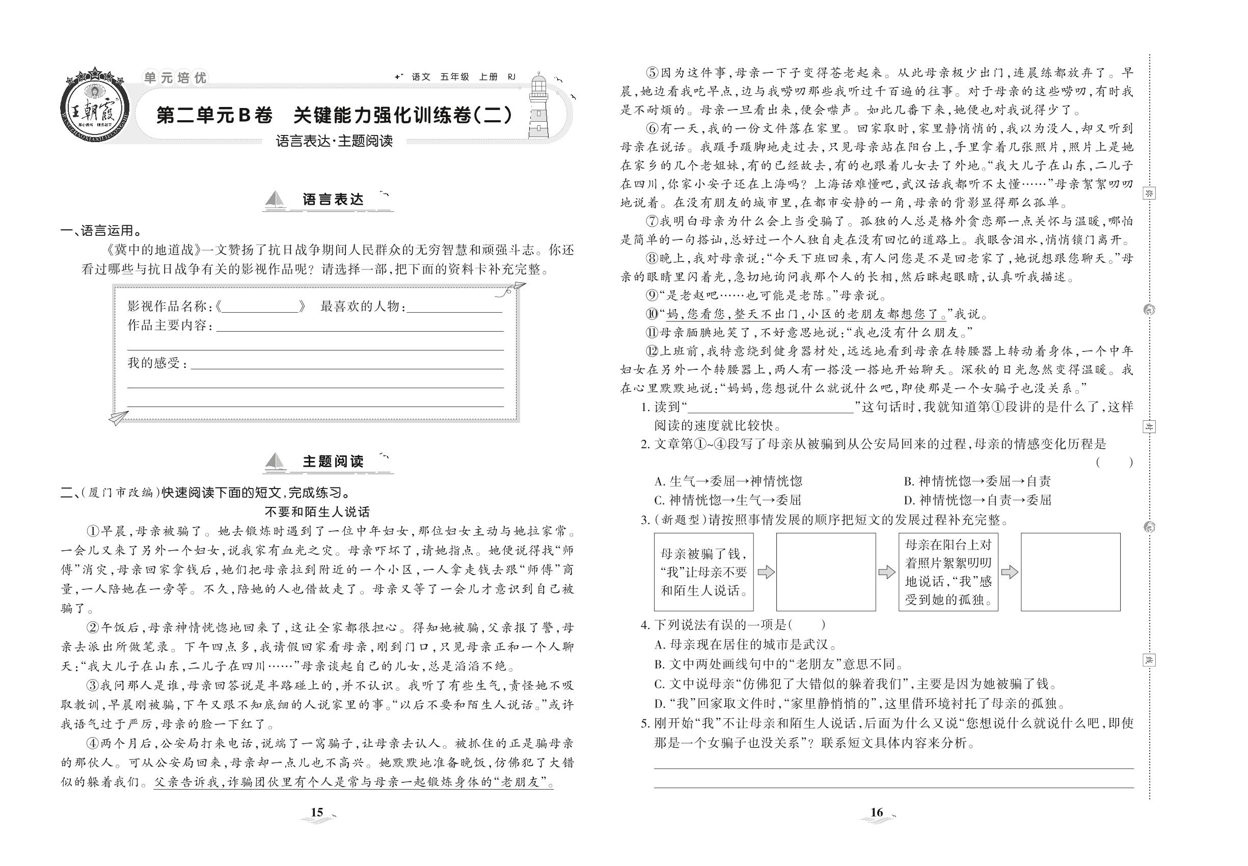 2021上册五年级语文人教版 第二单元B卷 关键能力强化训练卷(二)