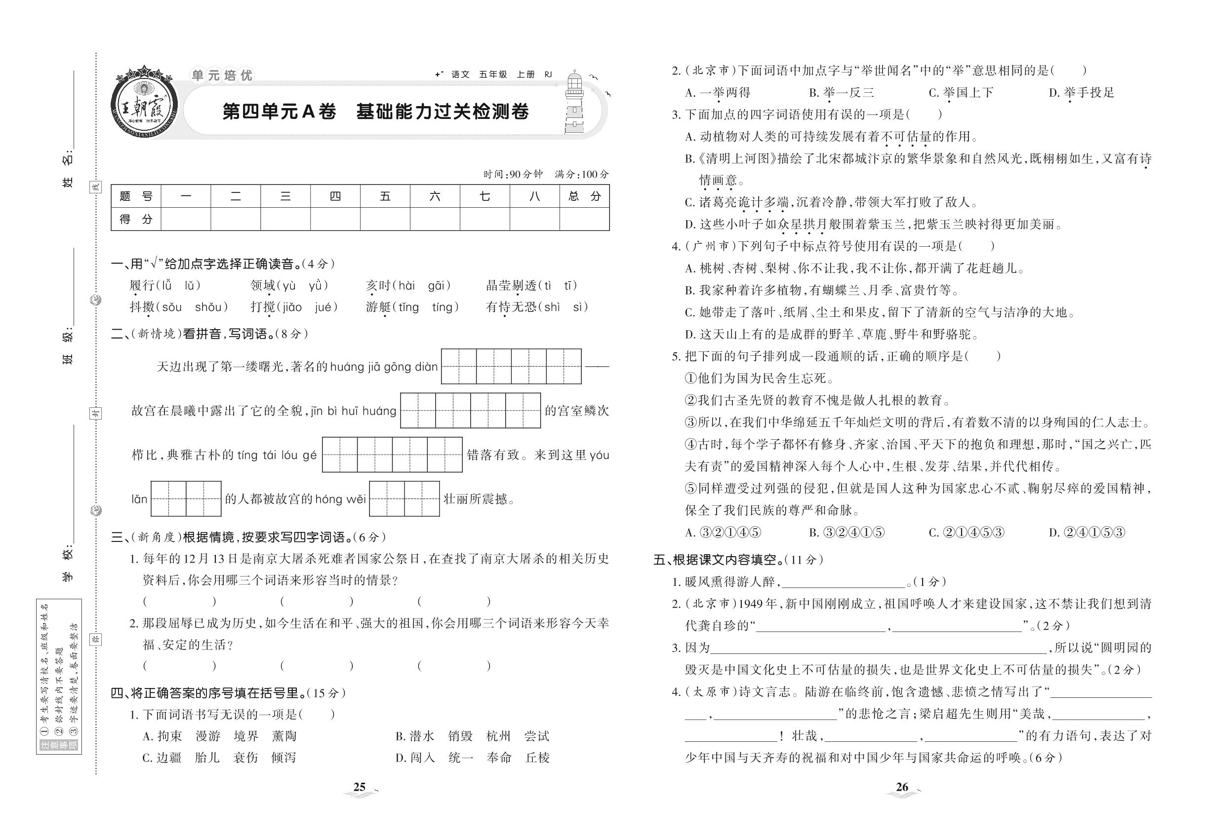 2021上册五年级语文人教版 第四单元A卷 基础能力过关检测卷