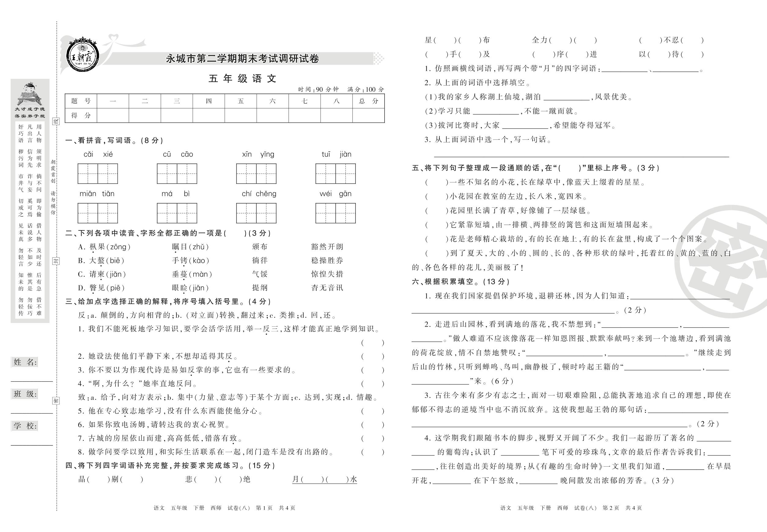 五年级语文西师版下册期末卷