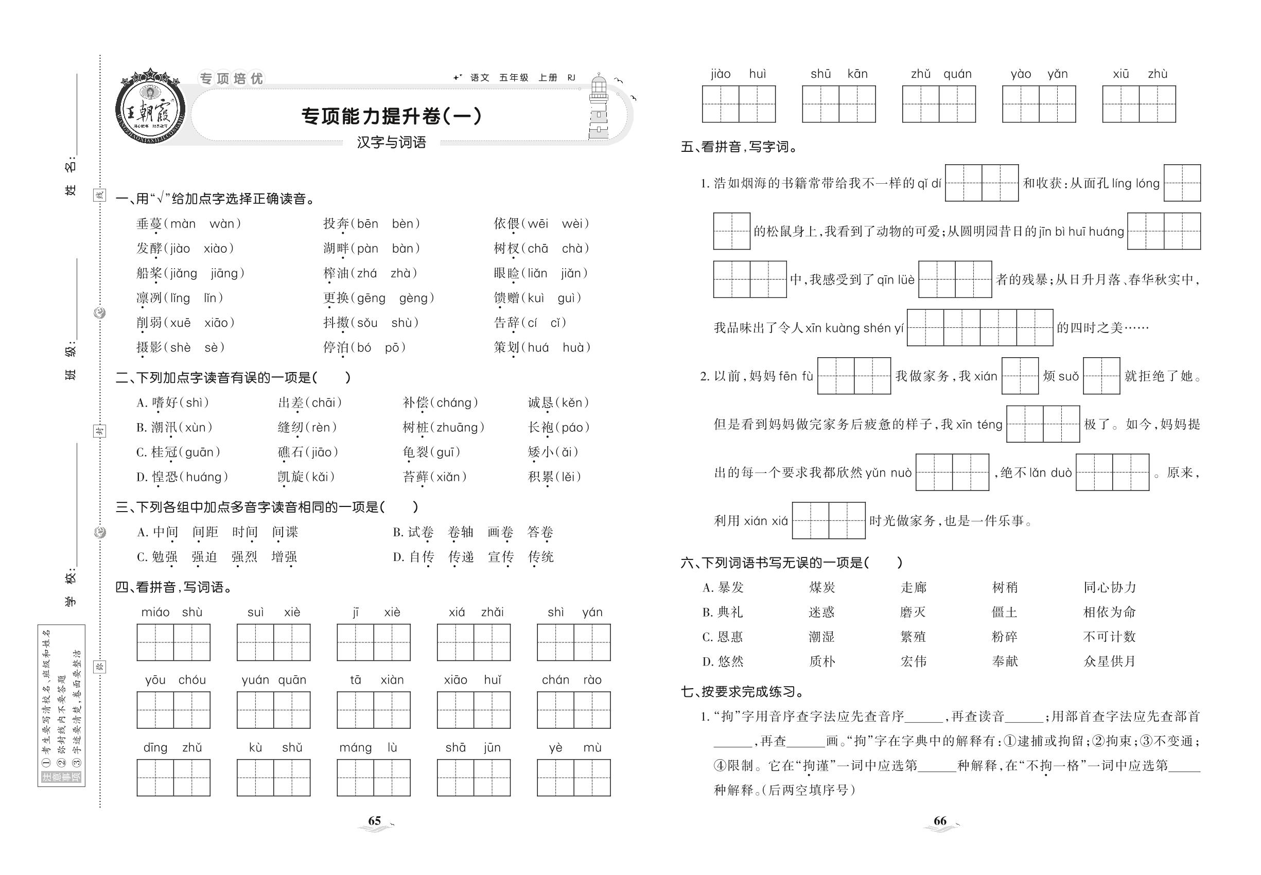 2021上册五年级语文人教版 专项能力提升卷(一) 汉字与词语