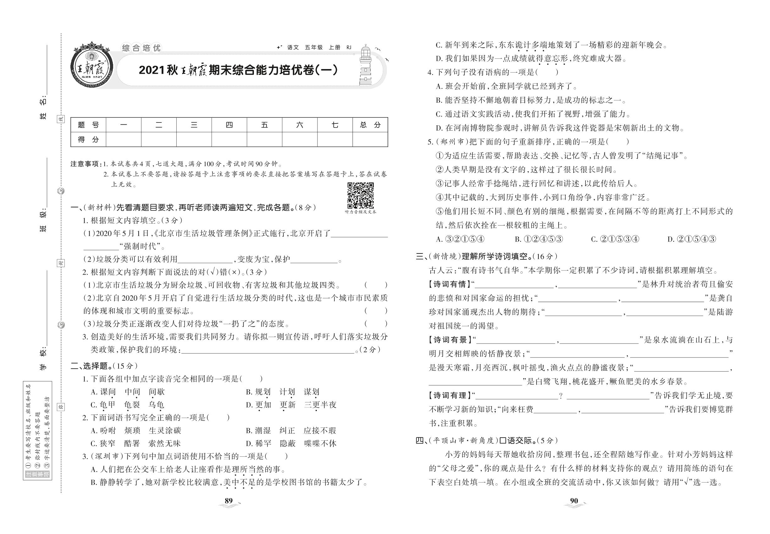 2021上册五年级语文人教版 王朝霞期末综合能力培优卷(一)