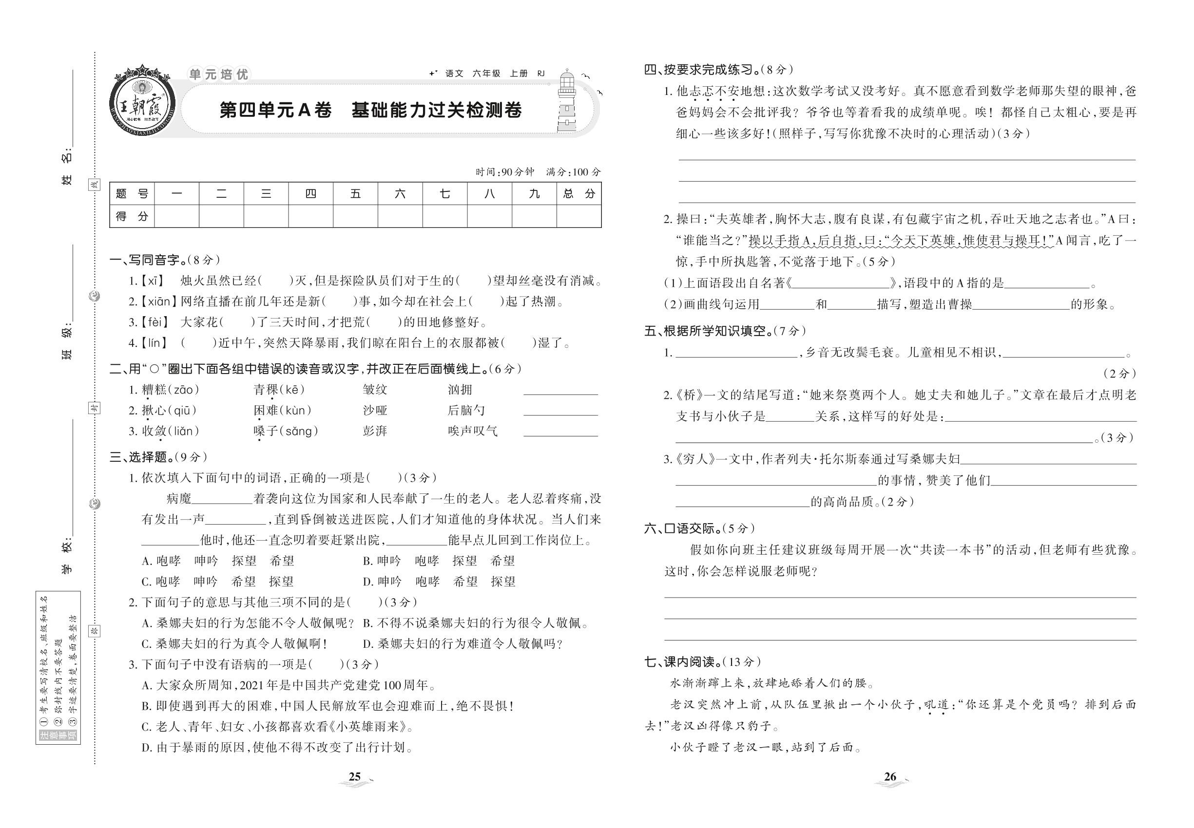 2021上册六年级语文人教版 第四单元A卷 基础能力过关检测卷