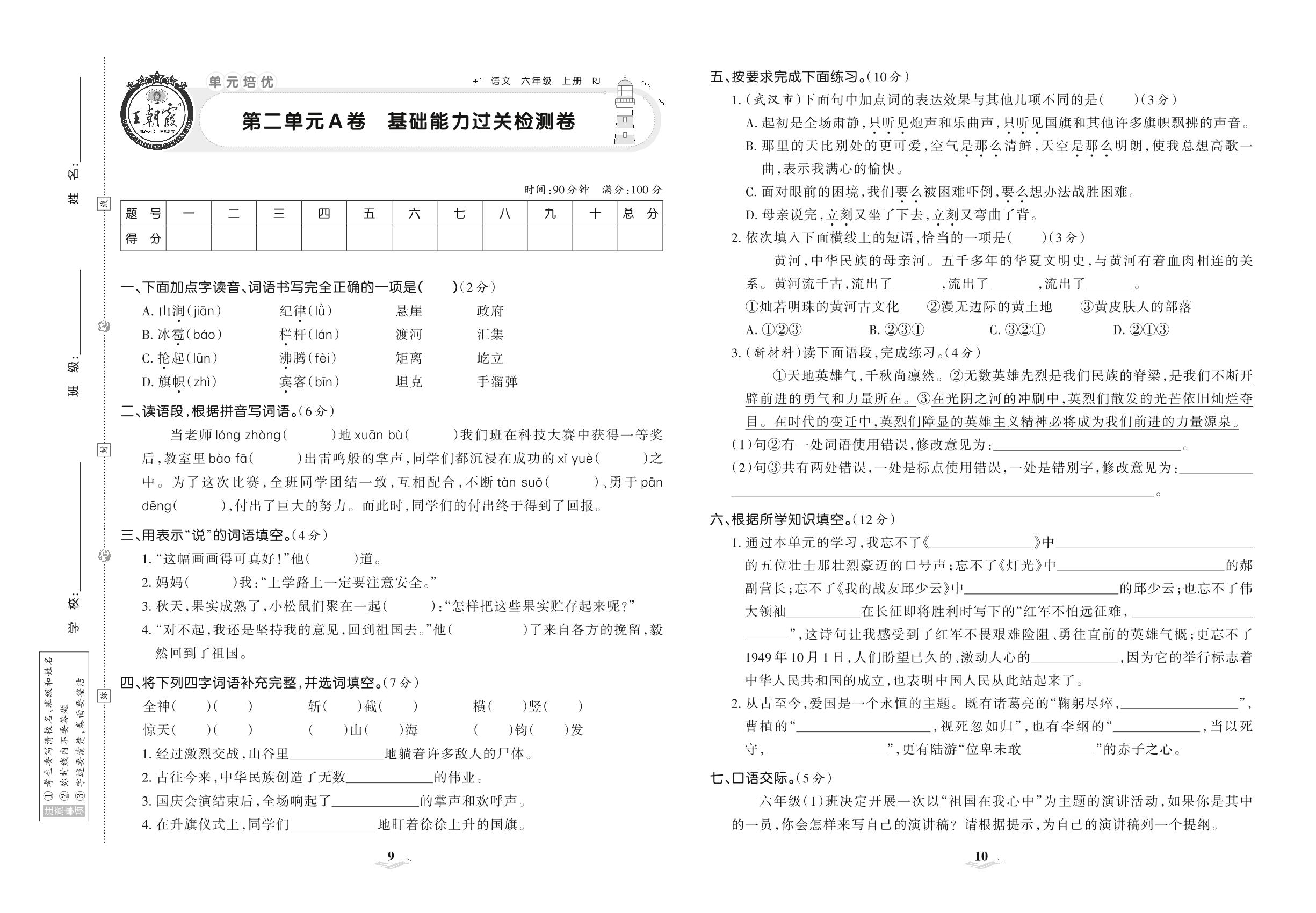 2021上册六年级语文人教版 第二单元A卷 基础能力过关检测卷