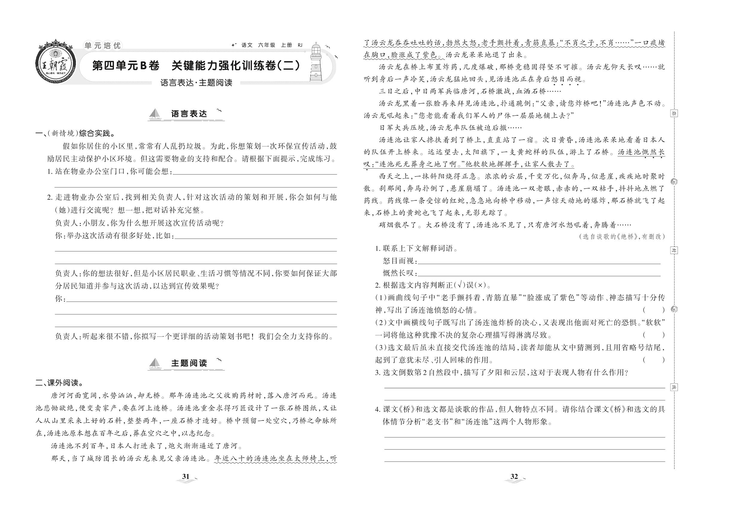 2021上册六年级语文人教版 第四单元B卷 关键能力强化训练卷(二)