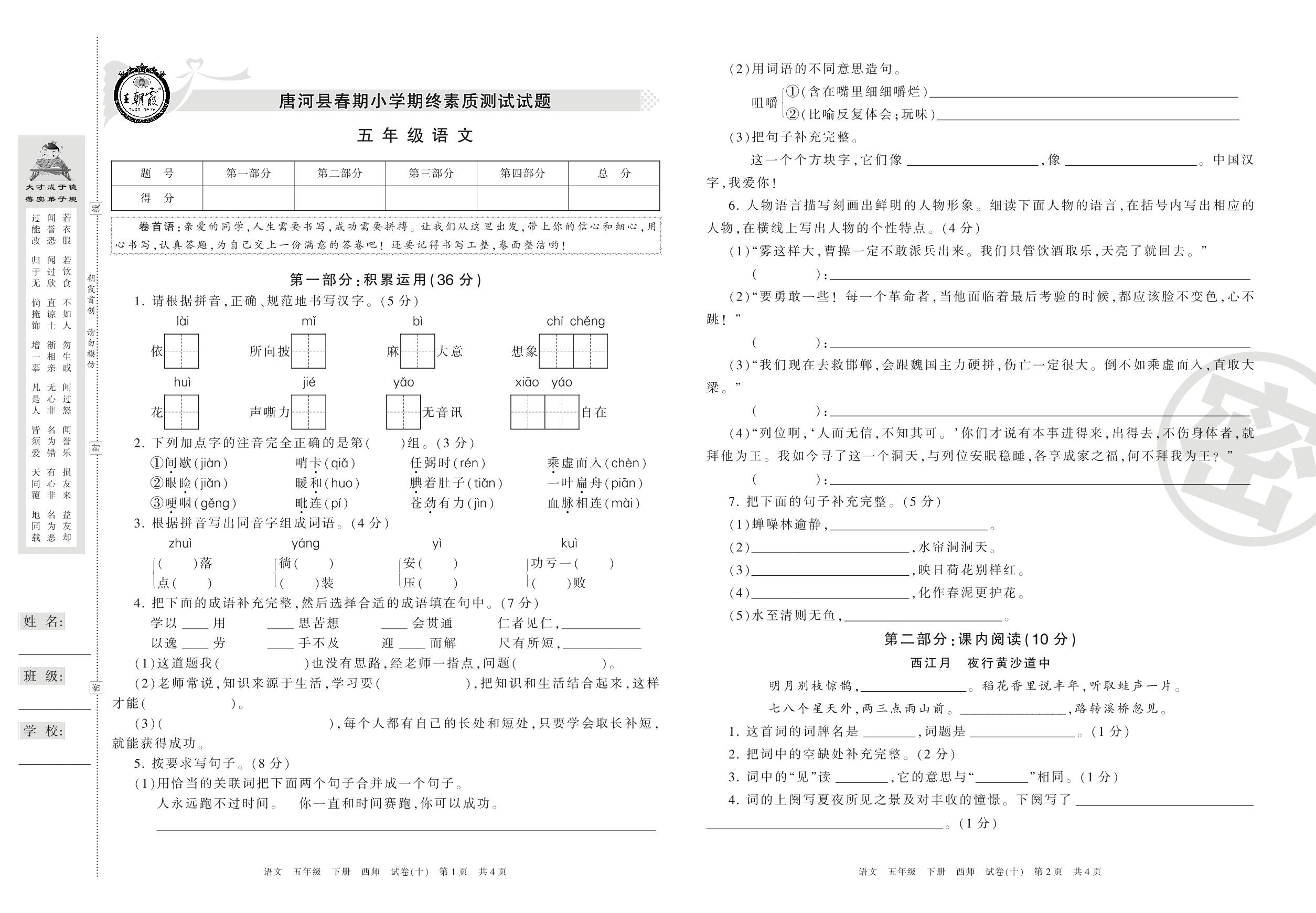 2015-2016学年第二学期南阳市唐河县五年级语文试卷(西师版)【10】