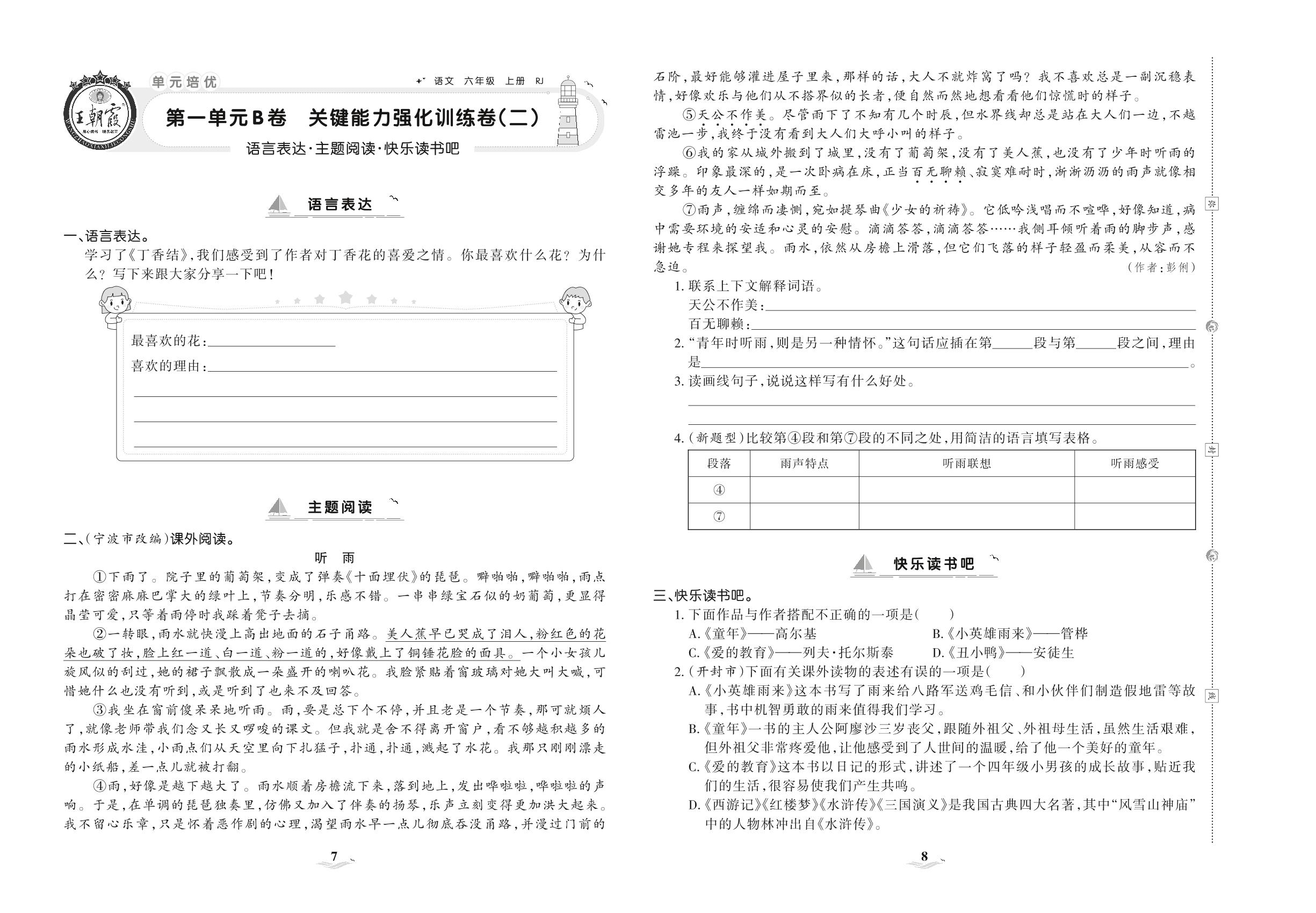 2021上册六年级语文人教版 第一单元B卷 关键能力强化训练卷(二)