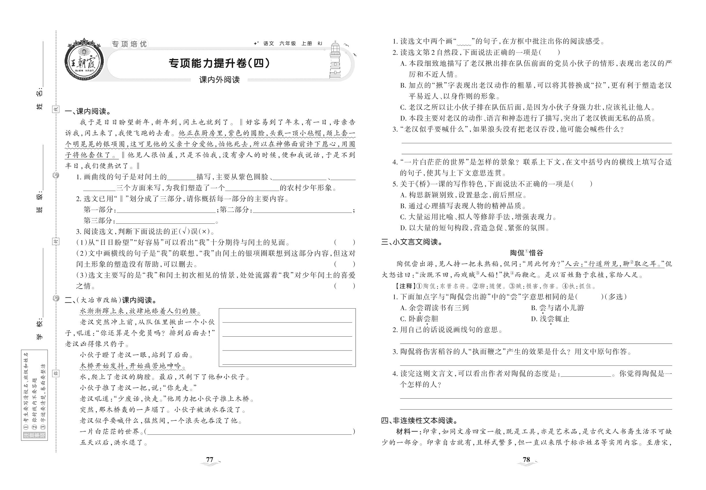2021上册六年级语文人教版 专项能力提升卷(四) 课内外阅读