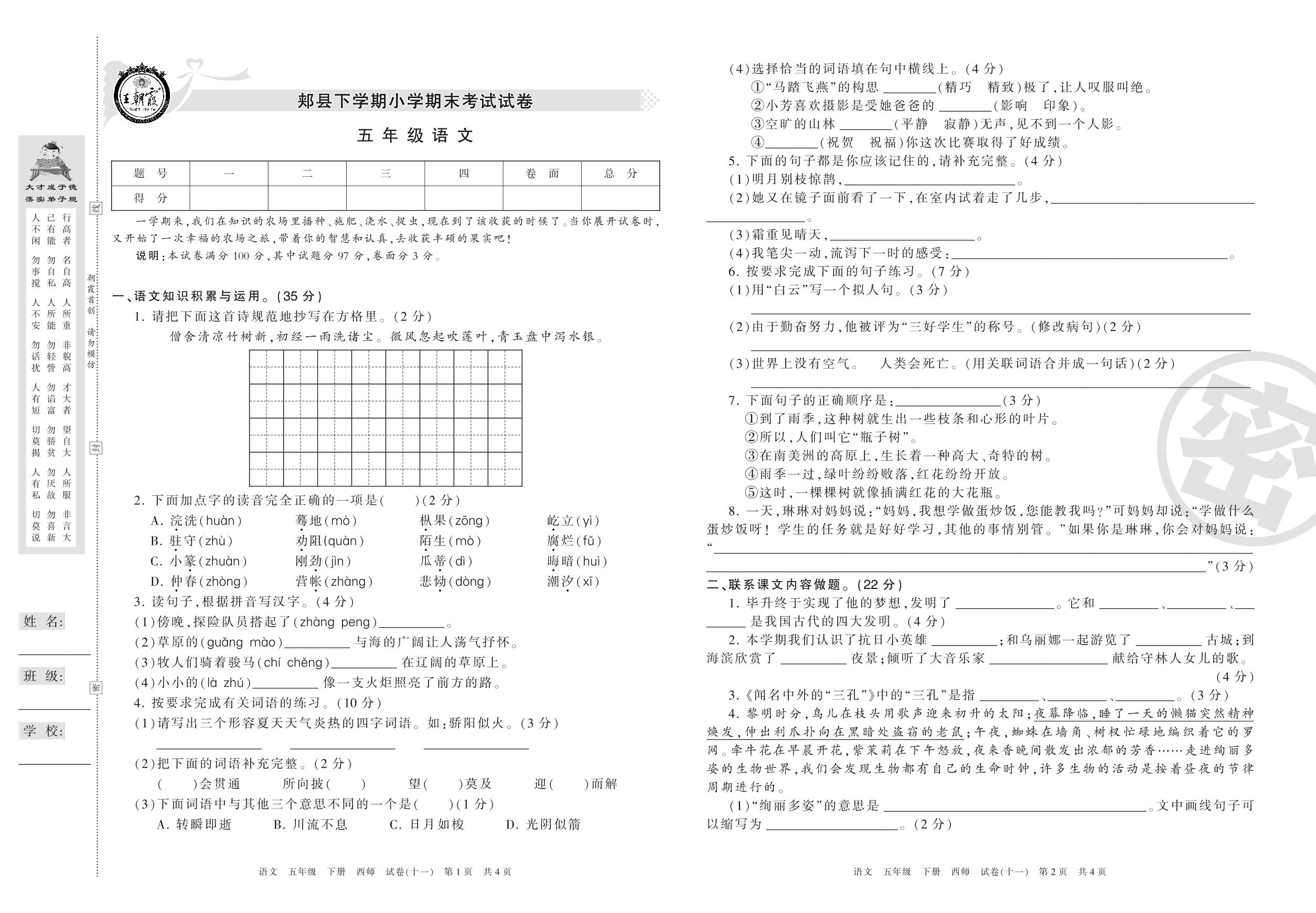 2015-2016学年第二学期平顶山市郏县五年级语文试卷(西师版)【11】