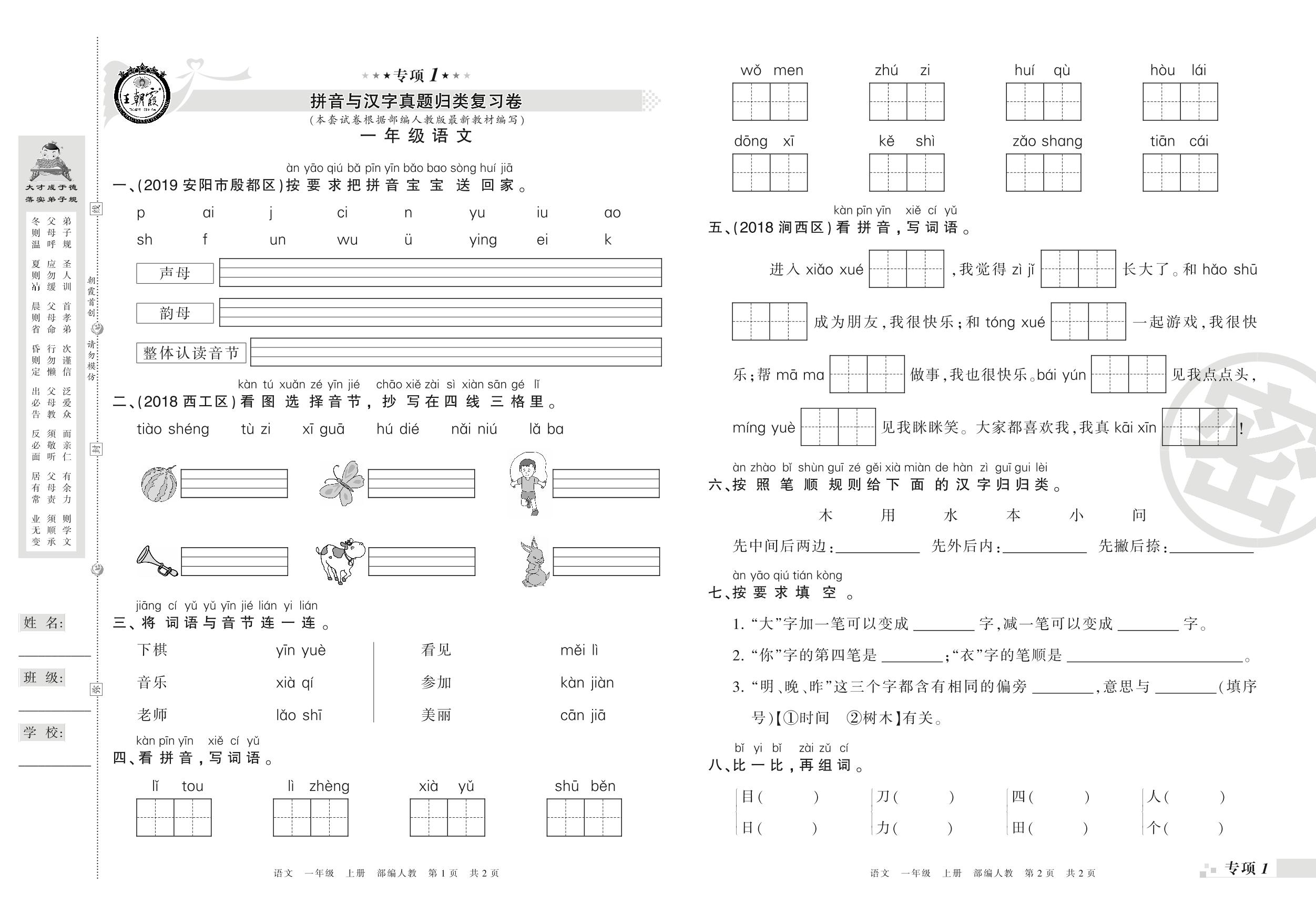 王朝霞期末专项卷——拼音与汉字、词语与句子真题归类复习卷一年级上册语文(人教版)_R210731181813【0】