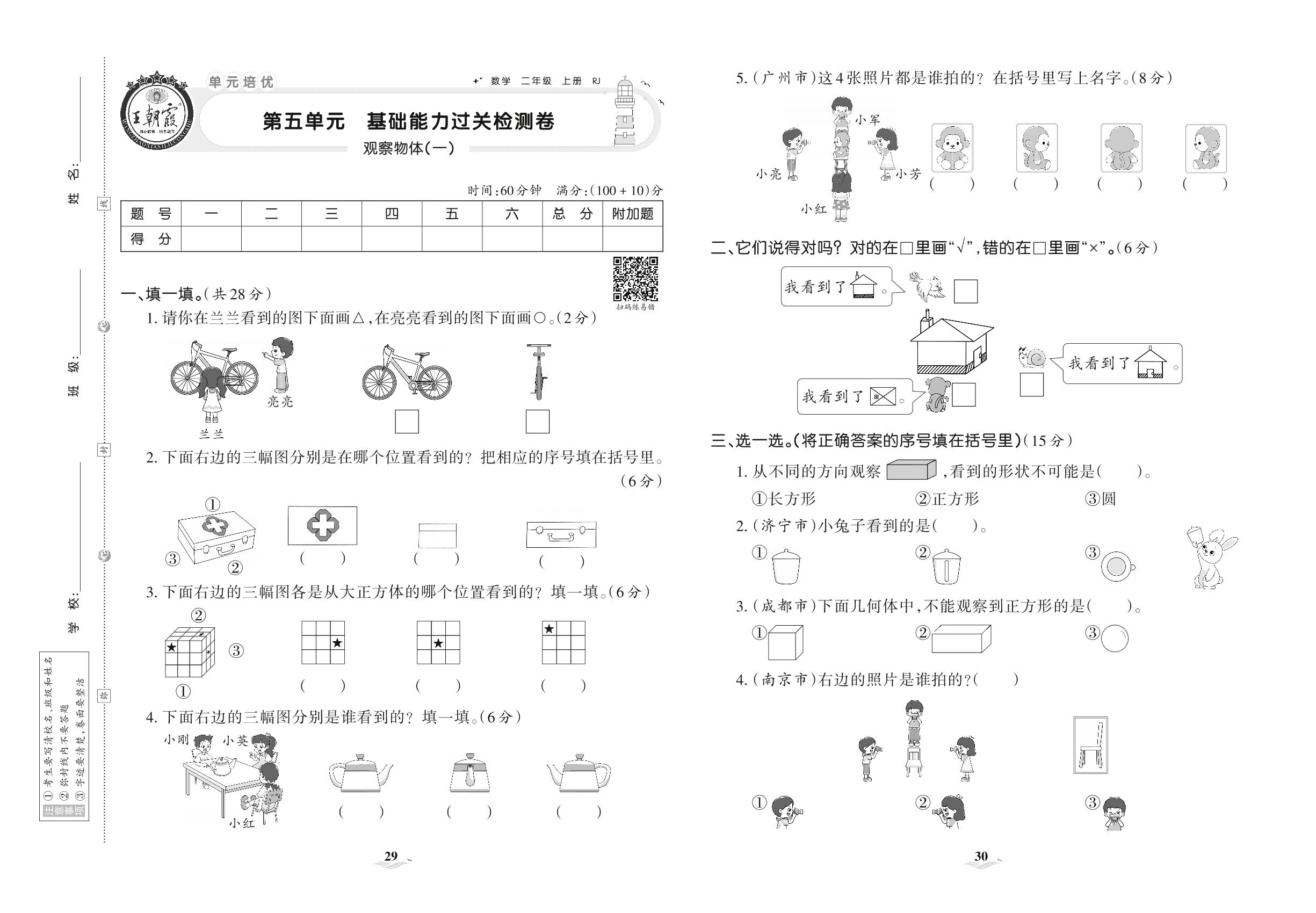 2021上册二年级数学人教版 第五单元 基础能力过关检测卷