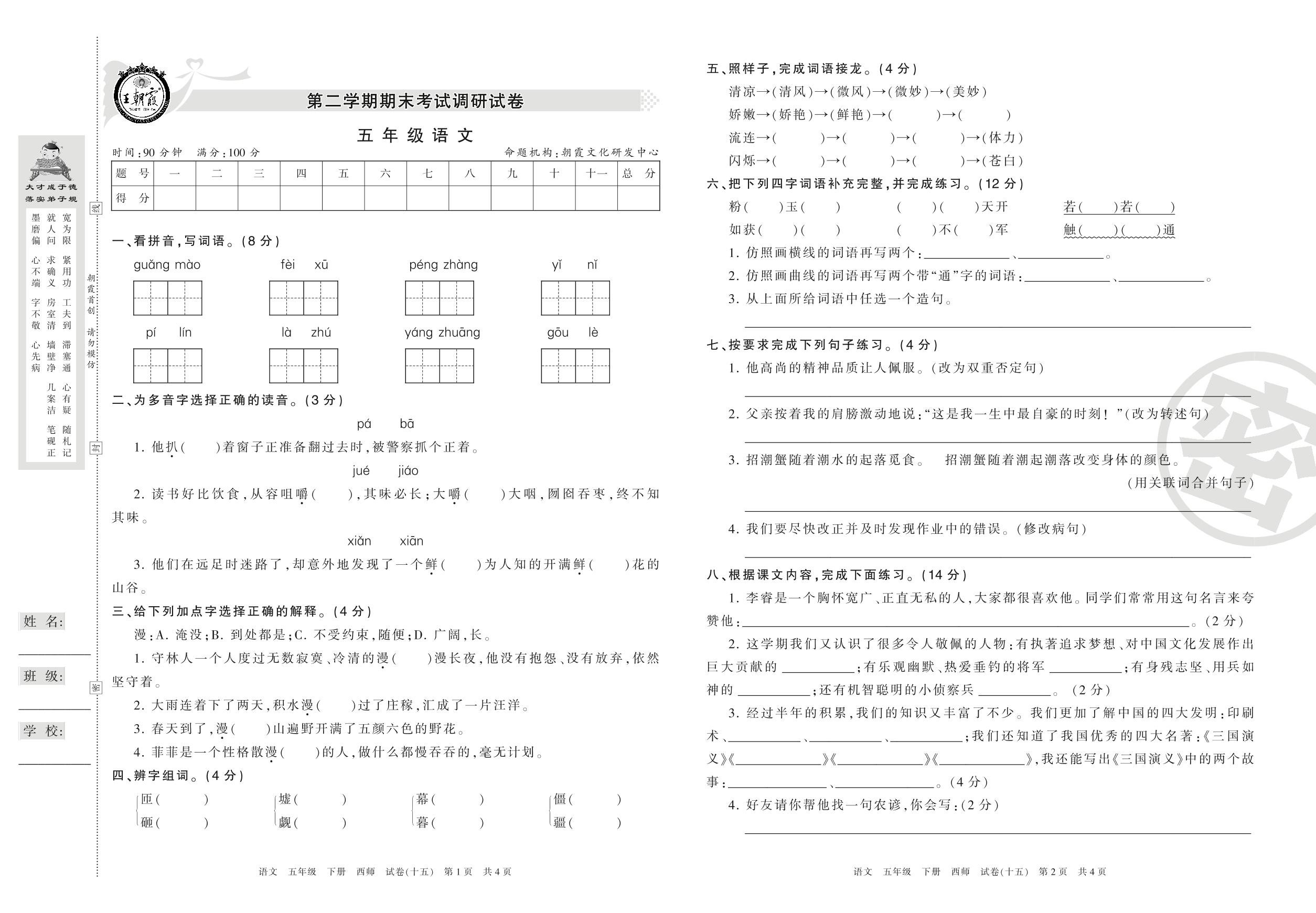 王朝霞期末调研卷五年级下册语文(西师版)【15】