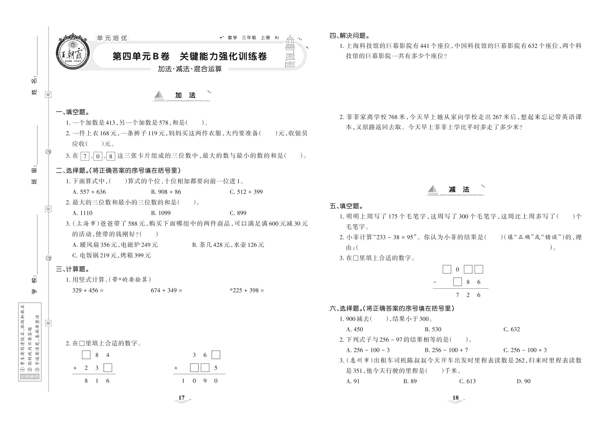 2021上册三年级数学人教版 第四单元B卷 关键能力强化训练卷