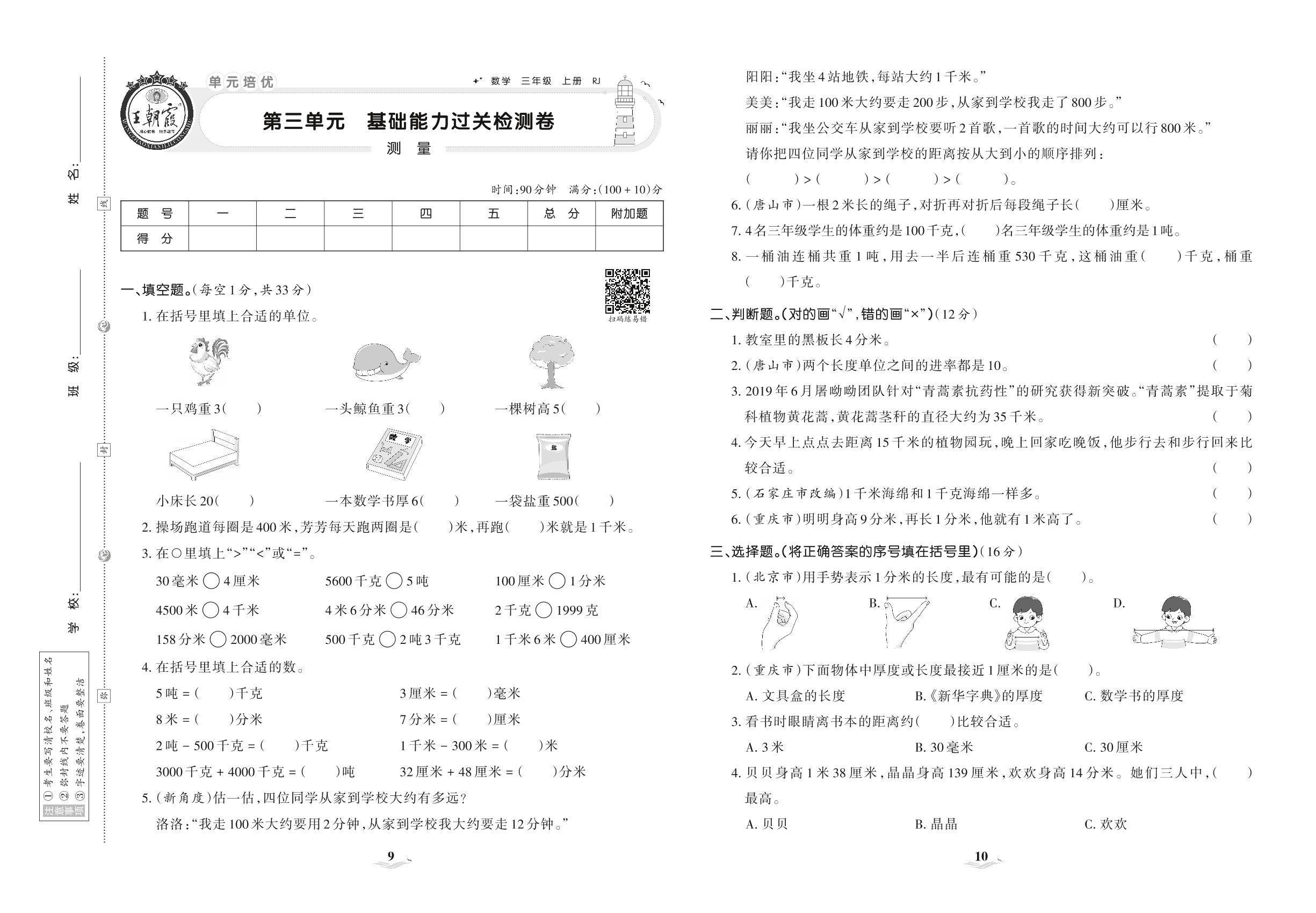 2021上册三年级数学人教版 第三单元 基础能力过关检测卷