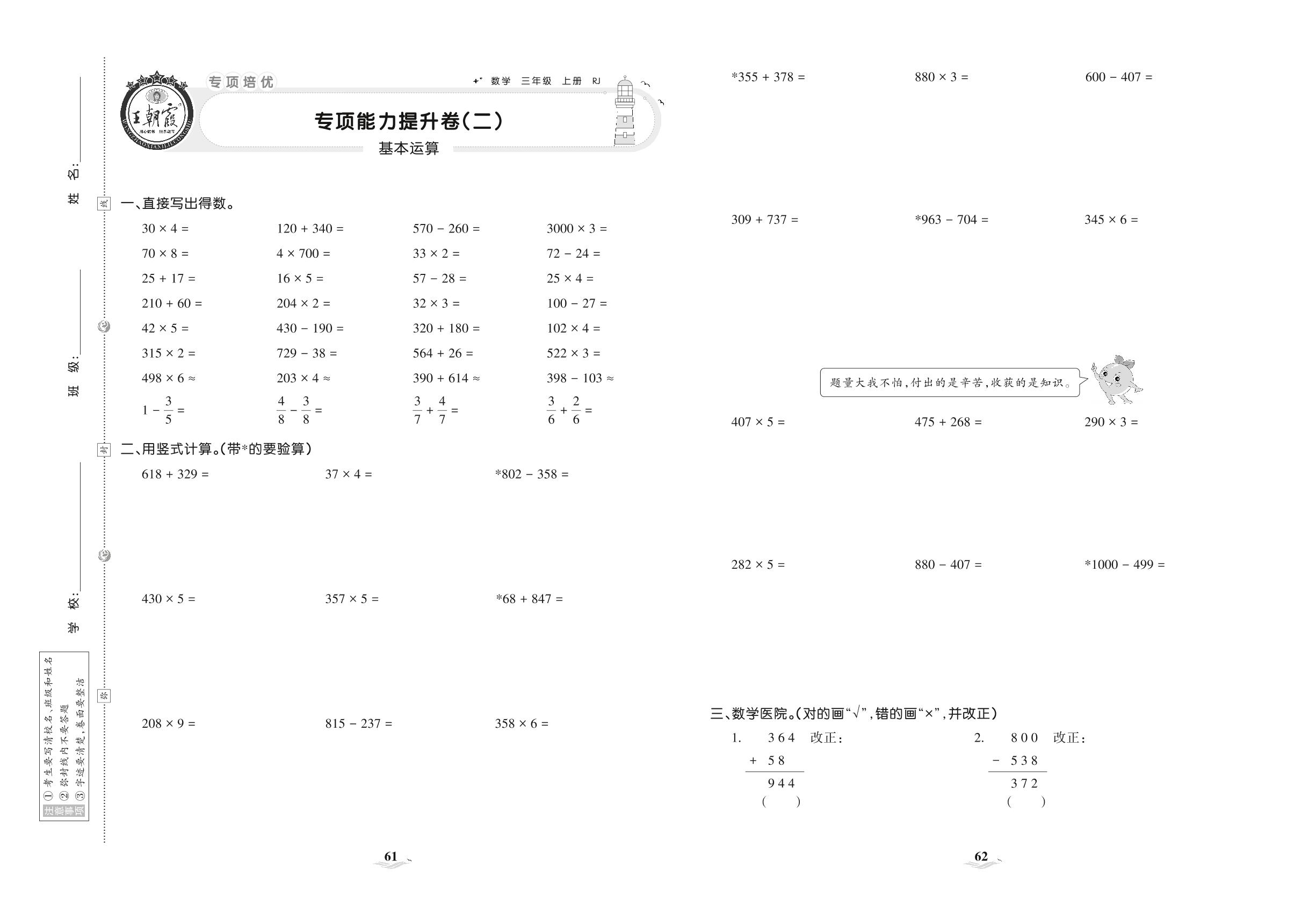 2021上册三年级数学人教版 专项能力提升卷(二) 基本运算