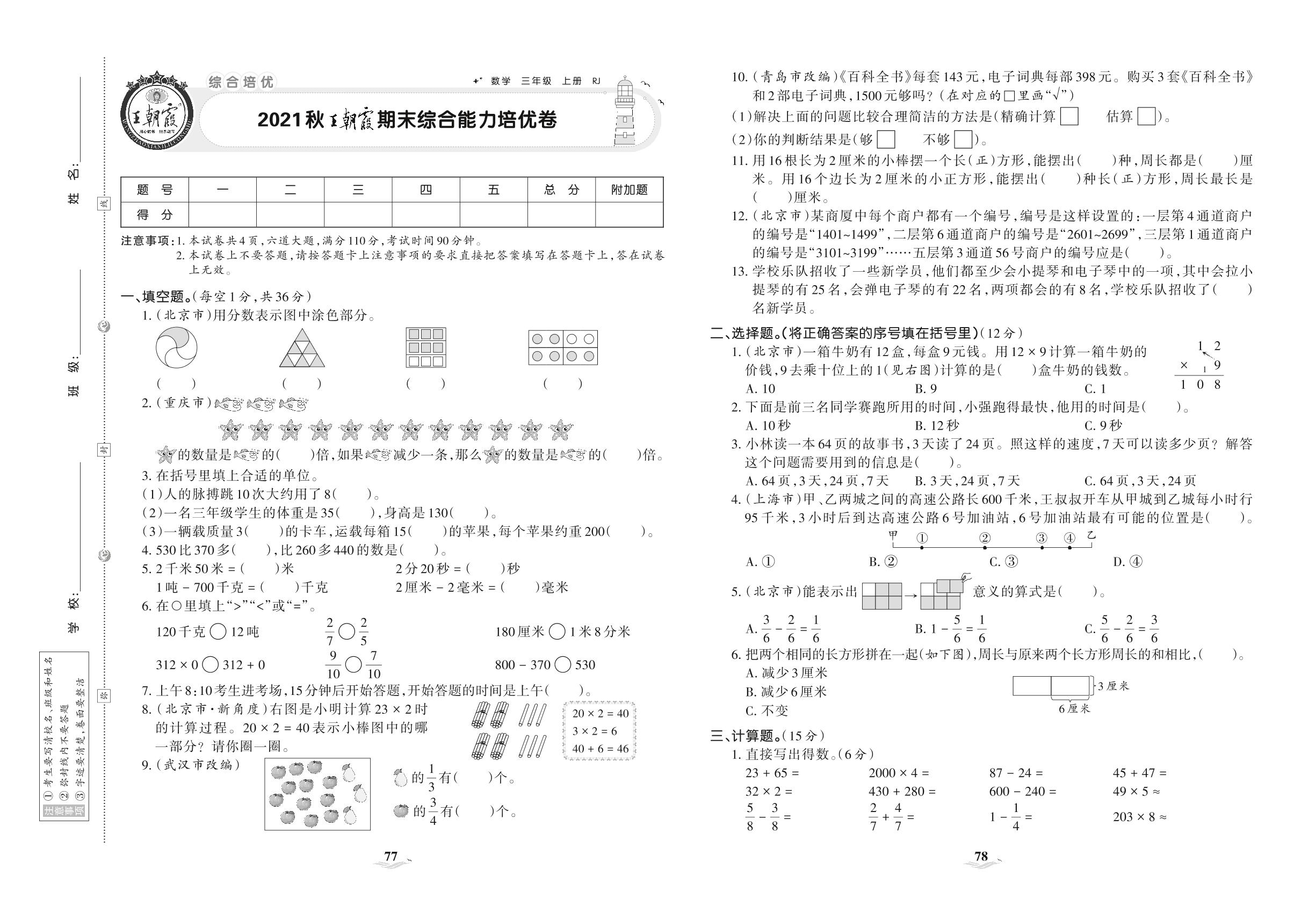 2021上册三年级数学人教版 王朝霞期末综合能力培优卷