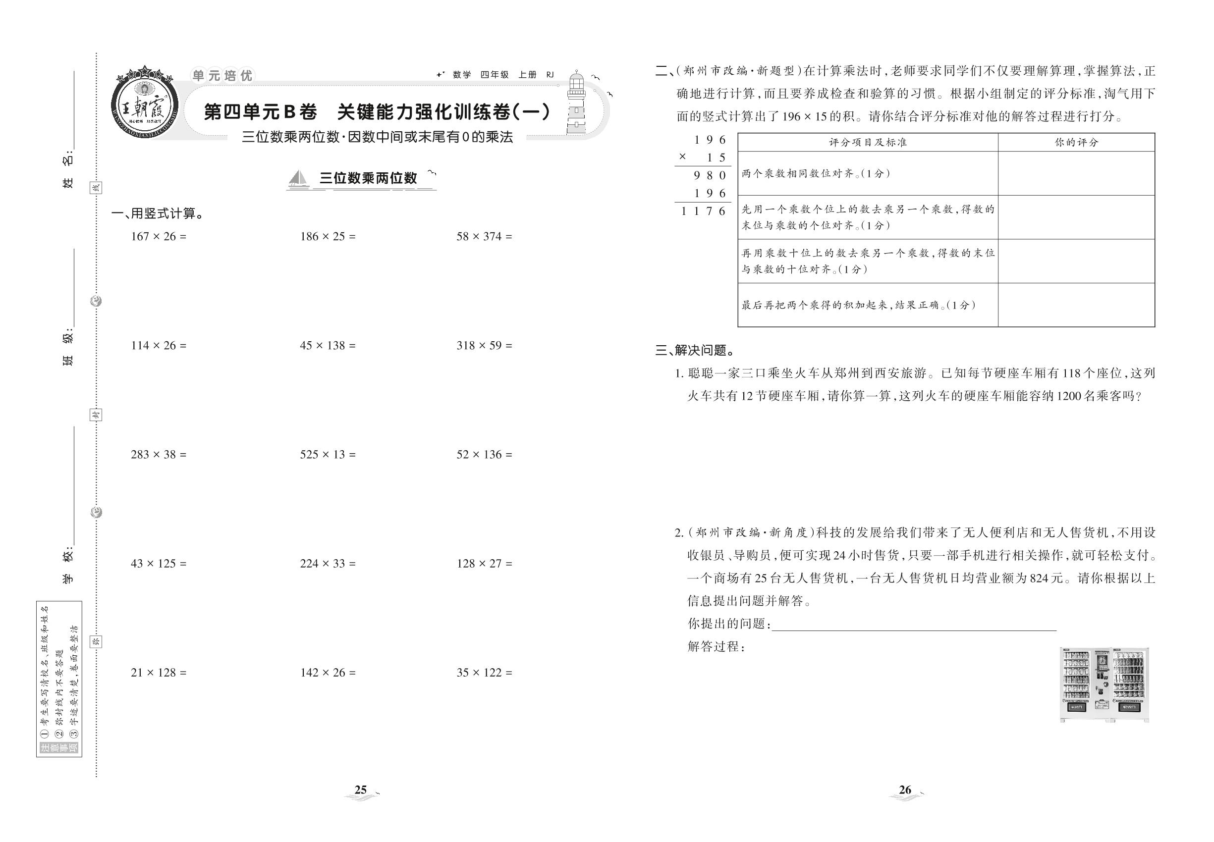 2021上册四年级数学人教版 第四单元B卷 关键能力强化训练卷(一)