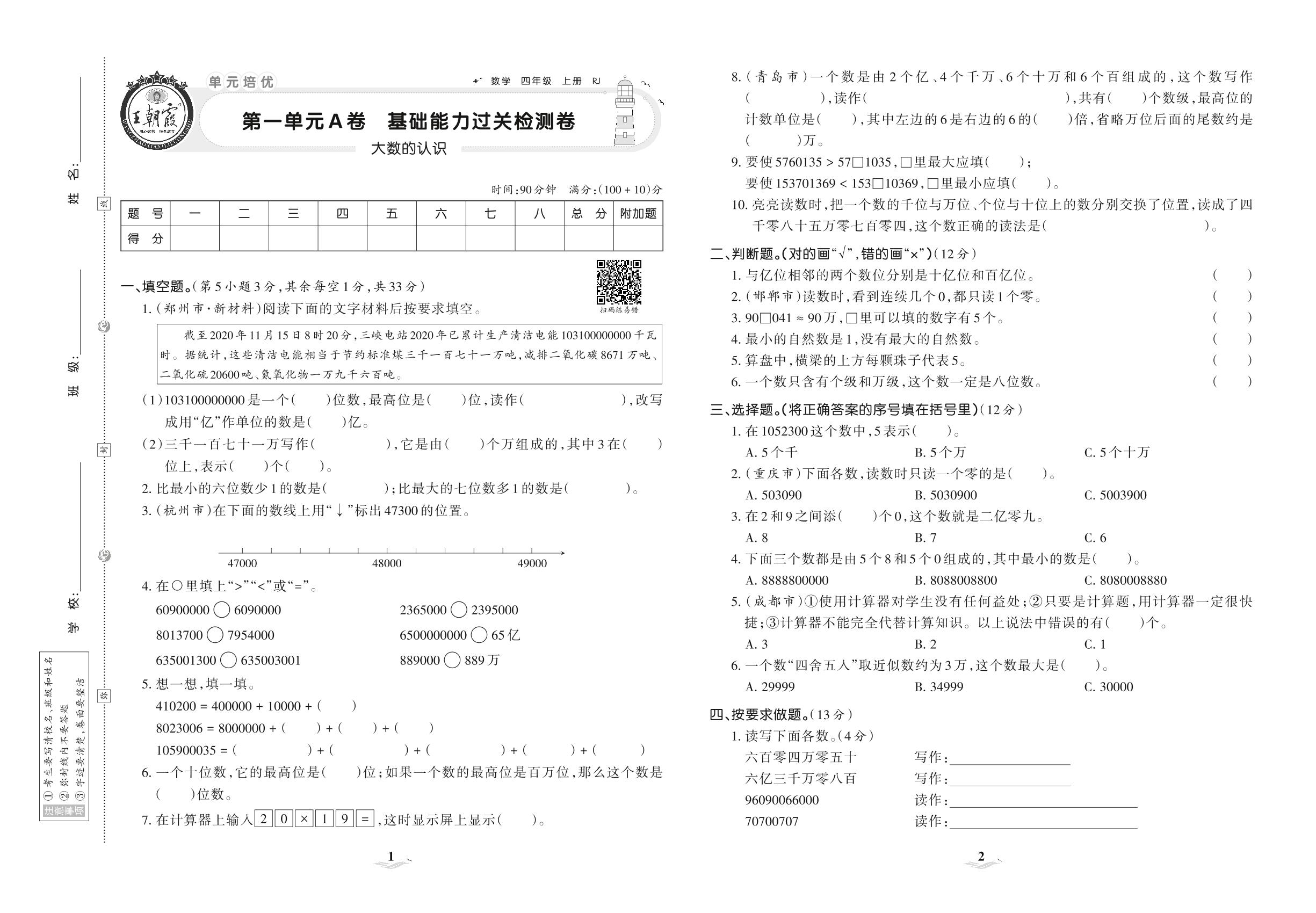 2021上册四年级数学人教版 第一单元A卷 基础能力过关检测卷