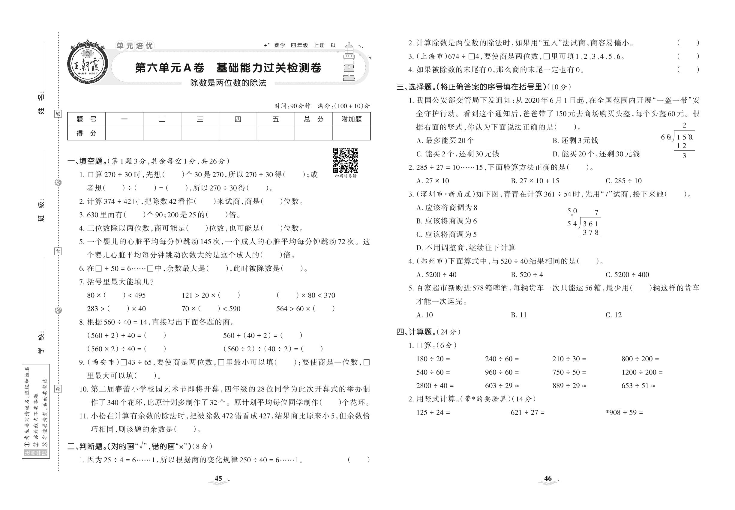 2021上册四年级数学人教版 第六单元A卷 基础能力过关检测卷